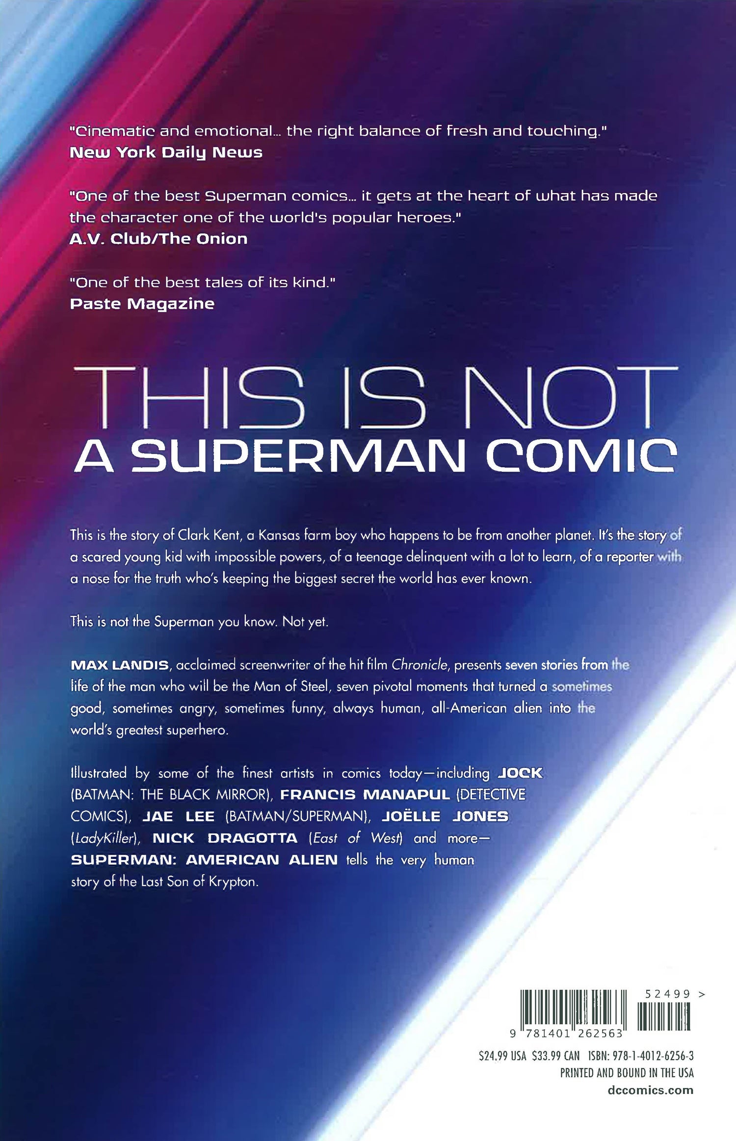 Illustrated by some of the greatest artists in comics today—including Jock (BATMAN: THE BLACK MIRROR), Francis Manapul (DETECTIVE COMICS), Jae Lee (BATMAN/SUPERMAN), Joëlle Jones (LADY KILLER), Nick Dragotta (EAST OF WEST) and more with covers by Ryan Sook (ACTION COMICS)—SUPERMAN: AMERICAN ALIEN tells the very human story of the Last Son of Krypton.