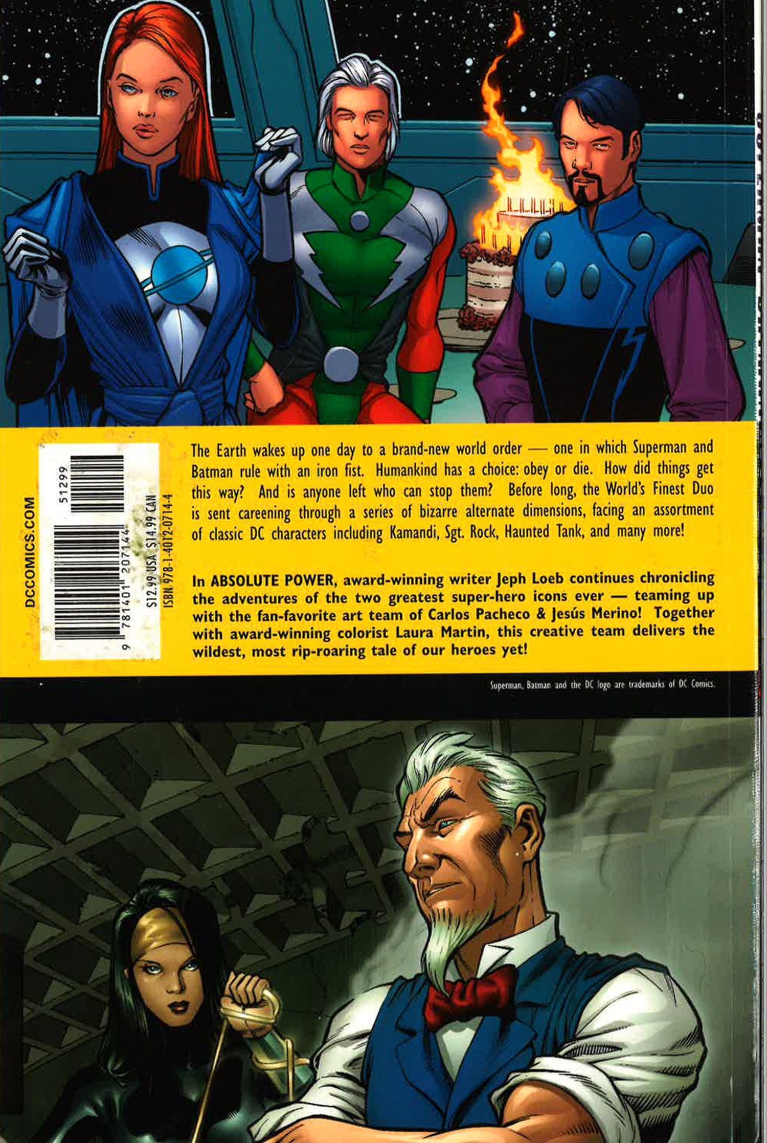 Written by Jeph Loeb Art and cover by Carlos Pacheco & Jesus Merino A new softcover collecting the blockbuster story "Absolute Power," originally presented in SUPERMAN/BATMAN #14-18! In this reality-bending tale, Superman and Batman rule Earth with an iron fist. Before long, the World's Finest Duo is sent careening through a series of bizarre alternate earths, facing an assortment of classic DC characters including Kamandi, Sgt. Rock, Haunted Tank, and many more! Advance-solicited; on sale November 8 * 128 pg, FC, $12.99 US