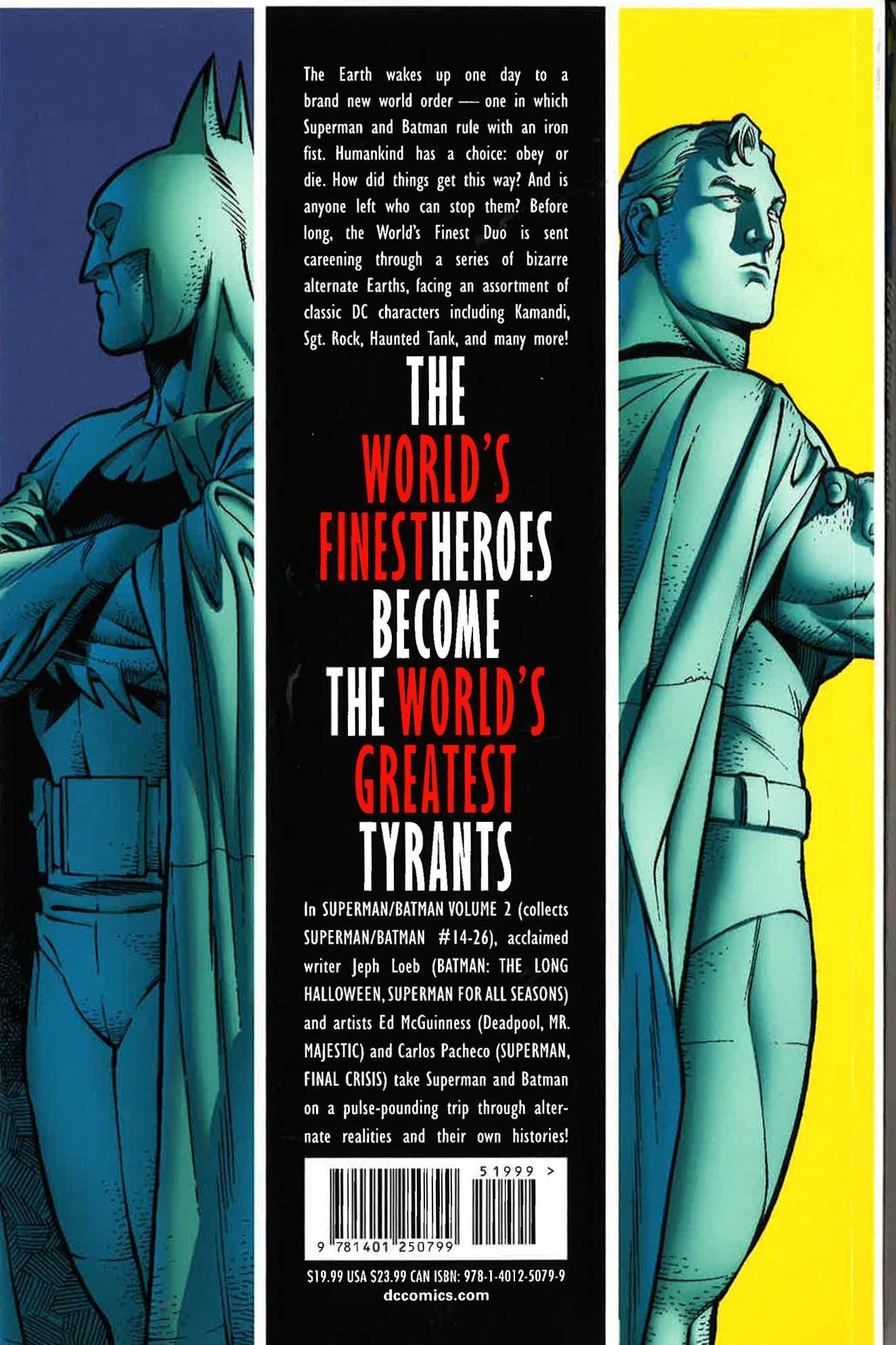 The Earth has a new world order in which Batman and Superman rule with an iron fist. Humankind has a choice: obey or die! But a resistance is formed against these dictators! Will these unlikely freedom fighters save the world or destroy it? Also, the World's Finest heroes take on a squad of revenge-seeking heroes on the hunt for the murderer of one of their teammates - and their top suspects are Batman and Superman. Collects SUPERMAN/BATMAN issues #14-26.