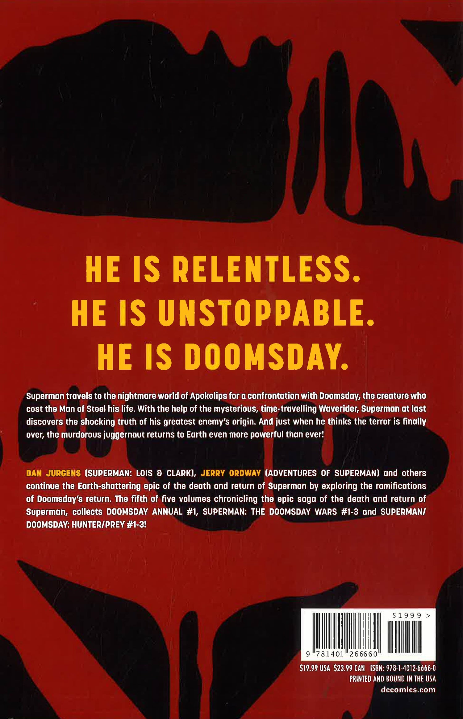 Superman travels to the nightmare world of Apokolips for a confrontation with Doomsday, the creature who cost the Man of Steel his life. With the help of the mysterious, time-traveling Waverider, Superman at last discovers the shocking truth of his greatest enemy's origin. And just when he thinks the terror is finally over, the murderous juggernaut returns to Earth even more powerful than ever!