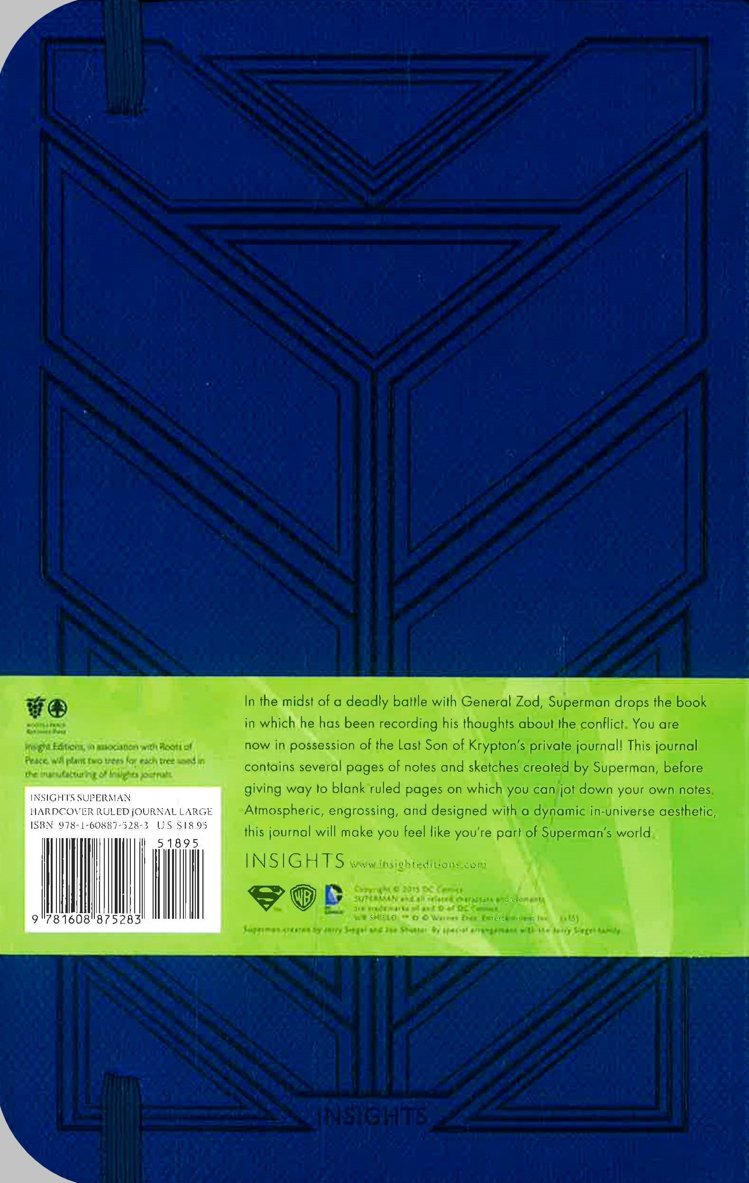 In the midst of a deadly battle with Lex Luthor, Superman drops the journal in which he has been recording his personal thoughts detailing his ongoing crusade for justice. You, citizen of Metropolis, are now in possession of the Last Son of Krypton's private journal. This ruled journal contains several pages of notes and sketches created by Superman, before giving way to blank ruled pages on which you can jot down your own notes. Atmospheric, engrossing, and designed with a dynamic in-universe aesthetic, this journal lets readers feel like they're part of Superman's world! With sturdy construction and sewn binding, this journal lies flat, and the 192 ruled, acid-free pages of high-quality heavy stock paper take both pen and pencil nicely to invite a flow of inspiration. Includes a ribbon placeholder, elastic closure, and 7.5 x 4.5-inch back pocket, perfect for holding photographs and mementos.