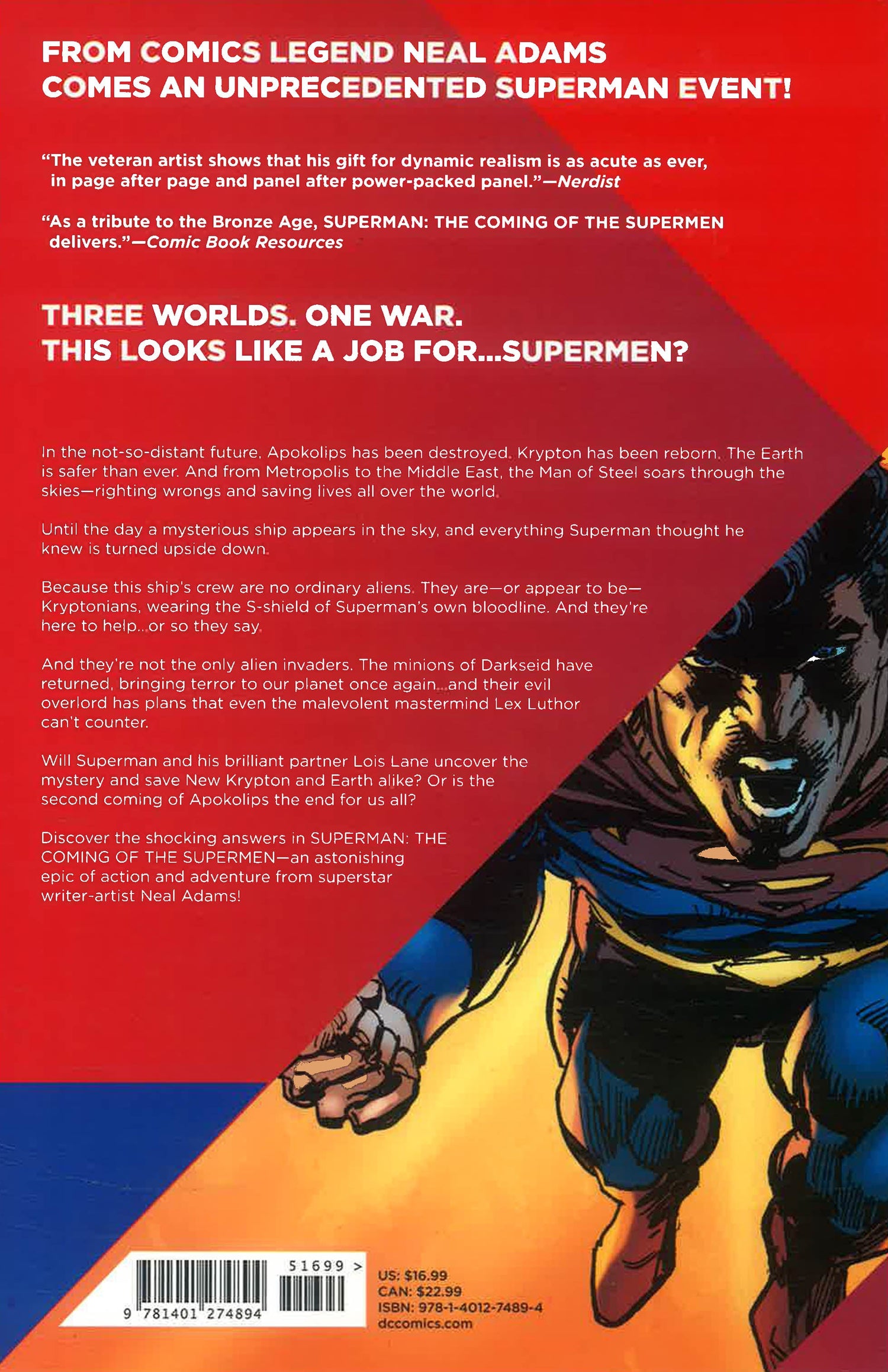 Legendary writer Neal Adams presents SUPERMAN: THE COMING OF THE SUPERMEN. In the not-so-distant future, Apokolips has been destroyed. Krypton has been reborn. Earth is safer than ever. And from Metropolis to the Middle East, the Man of Steel soars through the skies—righting wrongs and saving lives all over the world.