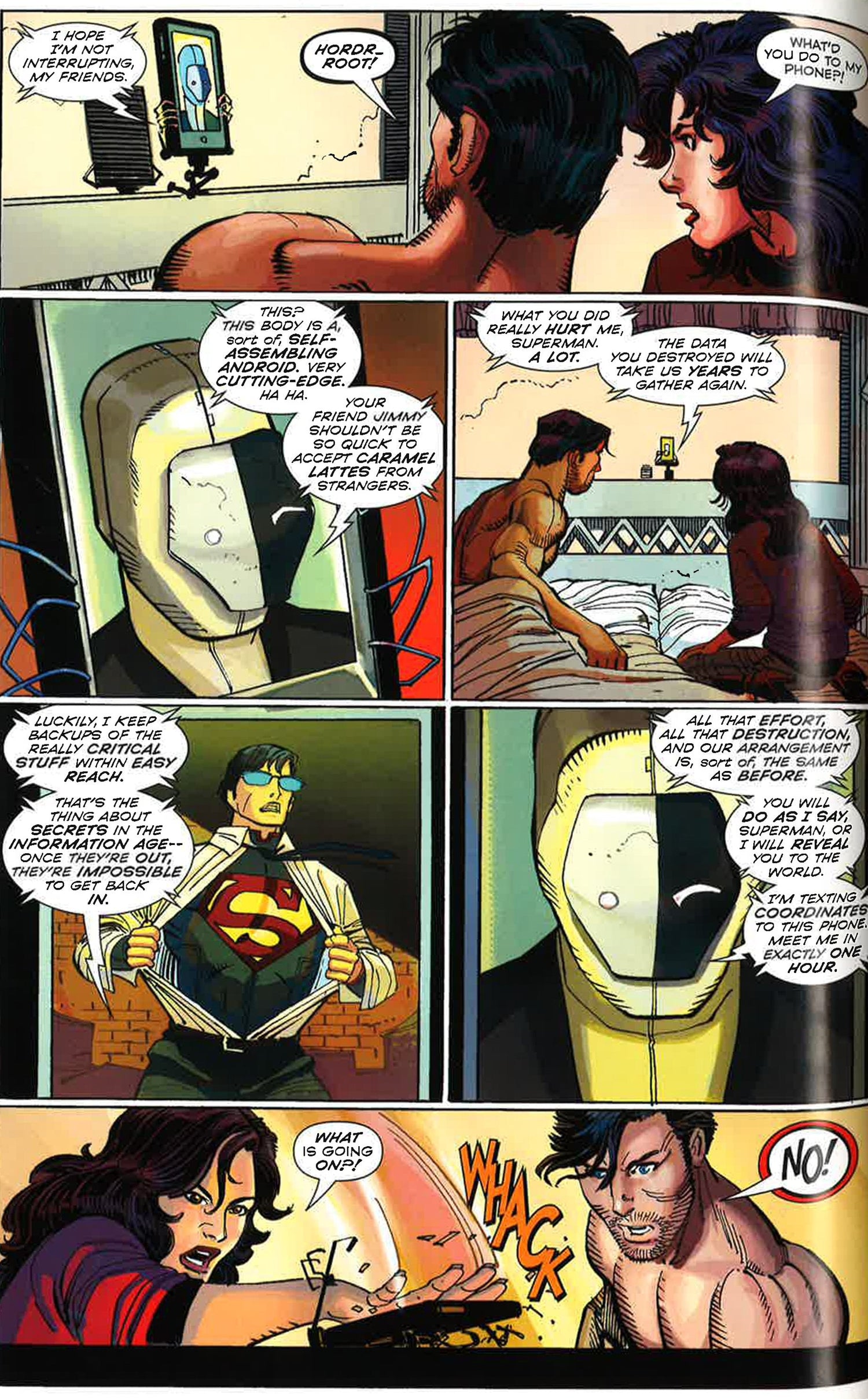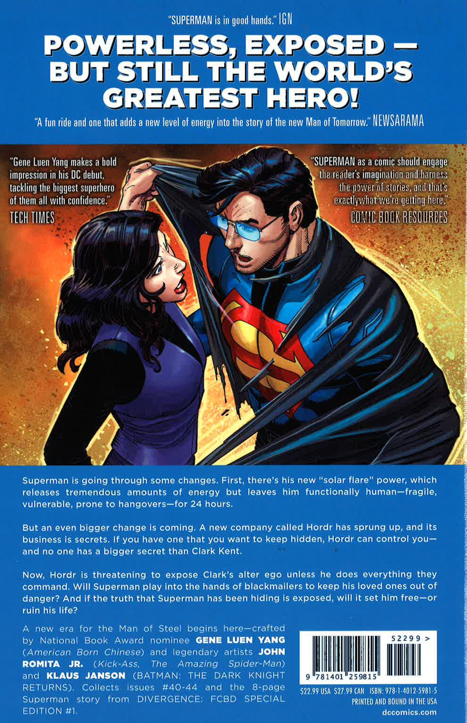Superman is going through some changes. First, there's his new "solar flare" power, which releases tremendous amounts of energy but leaves him functionally human - fragile, vulnerable, prone to hangovers - for 24 hours. But an even bigger change is coming. A new company called Hordr has sprung up, and its business is secrets. If you have one that you want to keep hidden, Hordr can control you - and no one has a bigger secret than Clark Kent. Now, Hordr is threatening to expose Clark's alter ego unless he does everything they command. Will Superman play into the hands of blackmailers to keep his loved ones out of danger? And if the truth that Superman has been hiding is exposed, will it set him free - or ruin his life?