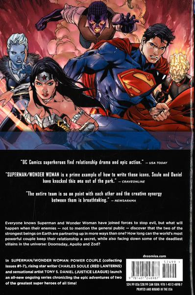 Beginning a bold new series that details the relationship between The Man of Steel and the Warrior Princess as writer Charles Soule (Swamp Thing) is joined by artist Tony S. Daniel (Batman) to tell the tale of a romance that will shake the stars themselves. These two super-beings love each other, but not everyone shares their joy. Some fear it, some test it - and some will try to kill for it. Some say love is a battlefield, but where Superman and Wonder Woman are concerned it spells Doomsday! Collects Issues #1-7 of Superman/Wonder Woman.