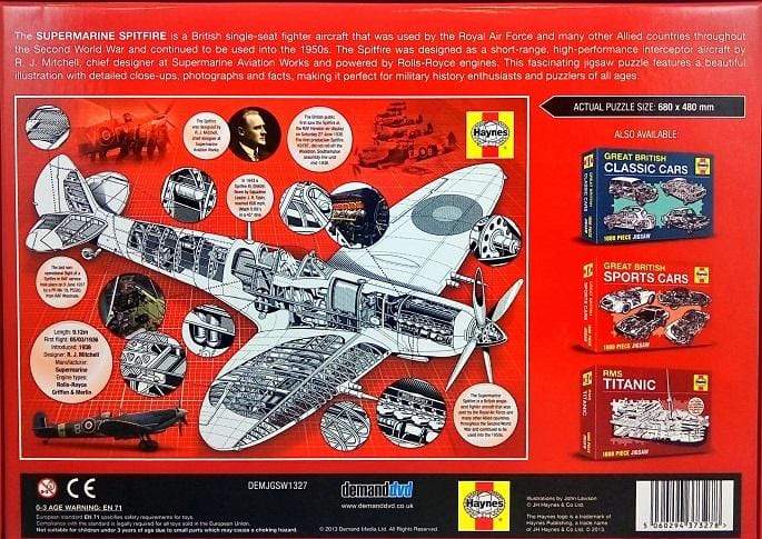 The Supermarine Spitfire is a British single-seat fighter aircraft that was used by the Royal Air Force and many other Allied countries throughout the Second World War and continued to be used into the 1950s. The Spitfire was designed as a short-range, high-performance interceptor aircraft by R. J. Mitchell, chief designer at Supermarine Aviation Works and powered by Rolls-Royce engines. This fascinating jigsaw puzzle features a beautiful illustration with detailed close-ups, photographs and facts, making it perfect for military history enthusiasts and puzzlers of all ages.< br>< br> Actual Puzzle Size: 680 x 480 mm
