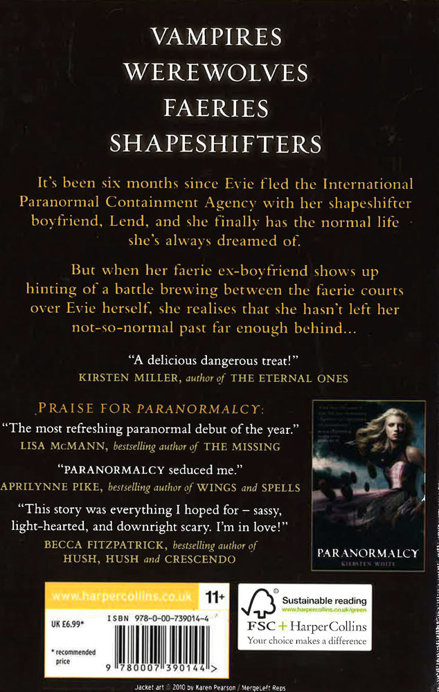 When your world is paranormal, be glad that you're human... the exciting sequel to bestselling PARANORMALCY, loved by Becca Fitzpatrick, author of HUSH, HUSH. A lot has changed since Evie escaped from the International Paranormal Containment Agency with her shapeshifter boyfriend, Lend. She's no longer occupied with bagging and tagging paranormals to be monitored at IPCA's headquarters. Instead, she spends her days at school like a normal teenager, eagerly awaiting the weekends when Lend comes home from college and trying not to be killed by overly enthusiastic soccer players in her gym class. Evie's world, in fact, has become overwhelmingly normal. And Evie is shocked to realise that normal can be...kind of boring. Then Raquel appears, asking her to help out at IPCA again. As Evie dips back into her former life, she learns that things are changing in the world of paranormals, and never-before-seen supernatural creatures are popping up left and right. Evie also has to deal with IPCA's newest teenage recruit who has the power to open faerie doors and a nasty tendency to show up in Evie's room unannounced. But nothing prepares her for the reappearance of her faerie ex-boyfriend Reth, who hints that a battle is brewing in the faerie world.And the prize they're fighting over? Evie's soul. Oh, bleep. So much for normal.