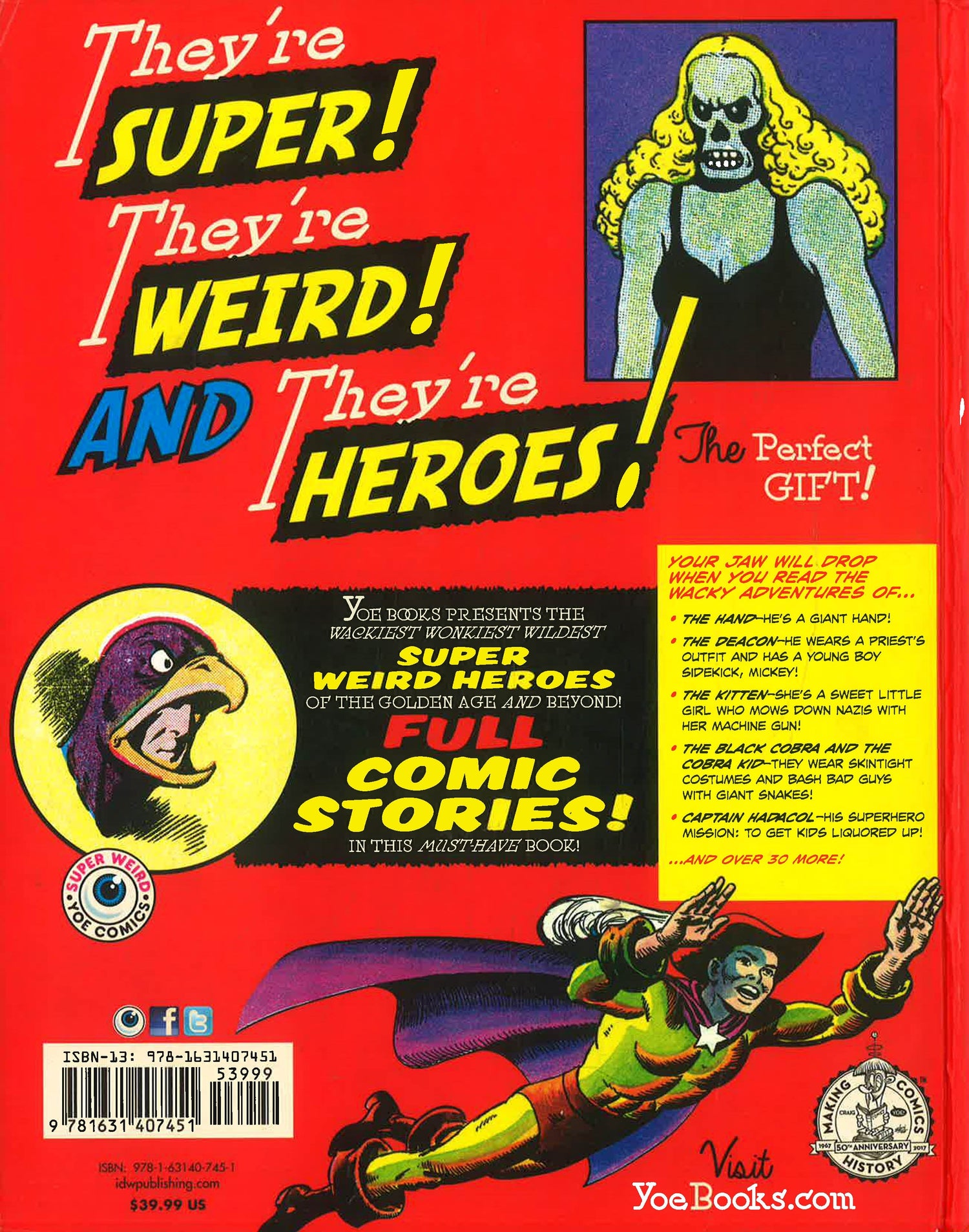 SUPER!--SUPER Weird Heroes is the first superhero book from Yoe Books/IDW! Over 500 pages, this ginormous tome is as thick as a brick! This bargained-priced book is filled with tons of rare, full-color, never-before-reprinted comics which could cost you hundreds of thousands of dollars on the collector's market! WEIRD!--Super WEIRD Heroes is the most bizarro, wacky, wild, astonishing eye-popping, jaw-dropping, book... EVAH! It's loaded with beyond-belief "WHAT TH'?!?!" moments! Wait till you tell your friends what you discover in its pages! HEROES!--Super Weird HEROES will make you laugh, cry, and be immensely entertained! You're going to witness Public Domain superheroes like The Hand (yes, he's a giant hand), The Eye (you got it--he's a yuuuge eye), The Bouncer (this super-hero-in-a-skirt's power is bouncing)! There's Rainbow Boy (he sports a towering rainbow mohawk on his head), Boomerang (he defeats Nazi hordes and weaponry by throwing a little boomerang), Kangaroo Man (don't jump to conclusions--he's even weirder than you think--his fighting partner is a talking kangaroo!). You'll spit-take your milk reading the adventures of The Yellowjacket (he fights villains with bees), Madame Fatal (a cross dressing hero), and Phantasmo (who fights criminals barely wearing any clothes at all)! And this is just a small fraction of the Super Weird Heroes you'll experience in this must-have book--there are over 65 super weird heroes in all! Super Weird Heroes is edited by the Eisner winner Craig Yoe who Vice Magaizine called, "The Indiana Jones of nerd-perv artifacts!"
