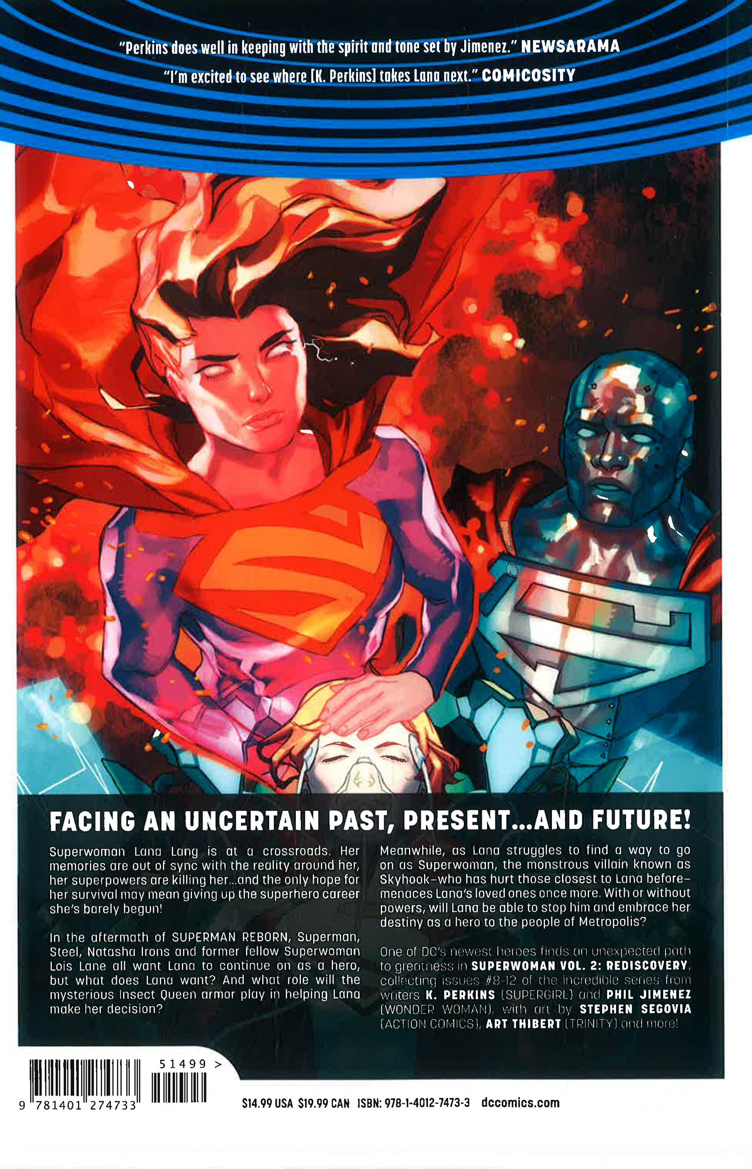 One of DC’s newest heroes finds an unexpected path to greatness in SUPERWOMAN VOL. 2: REDISCOVERY, collecting issues #8-12 of the series from writers K. Perkins (SUPERGIRL) and Phil Jimenez, with art by Jimenez (WONDER WOMAN), Stephen Segovia (ACTION COMICS), Art Thibert (TRINITY) and more!