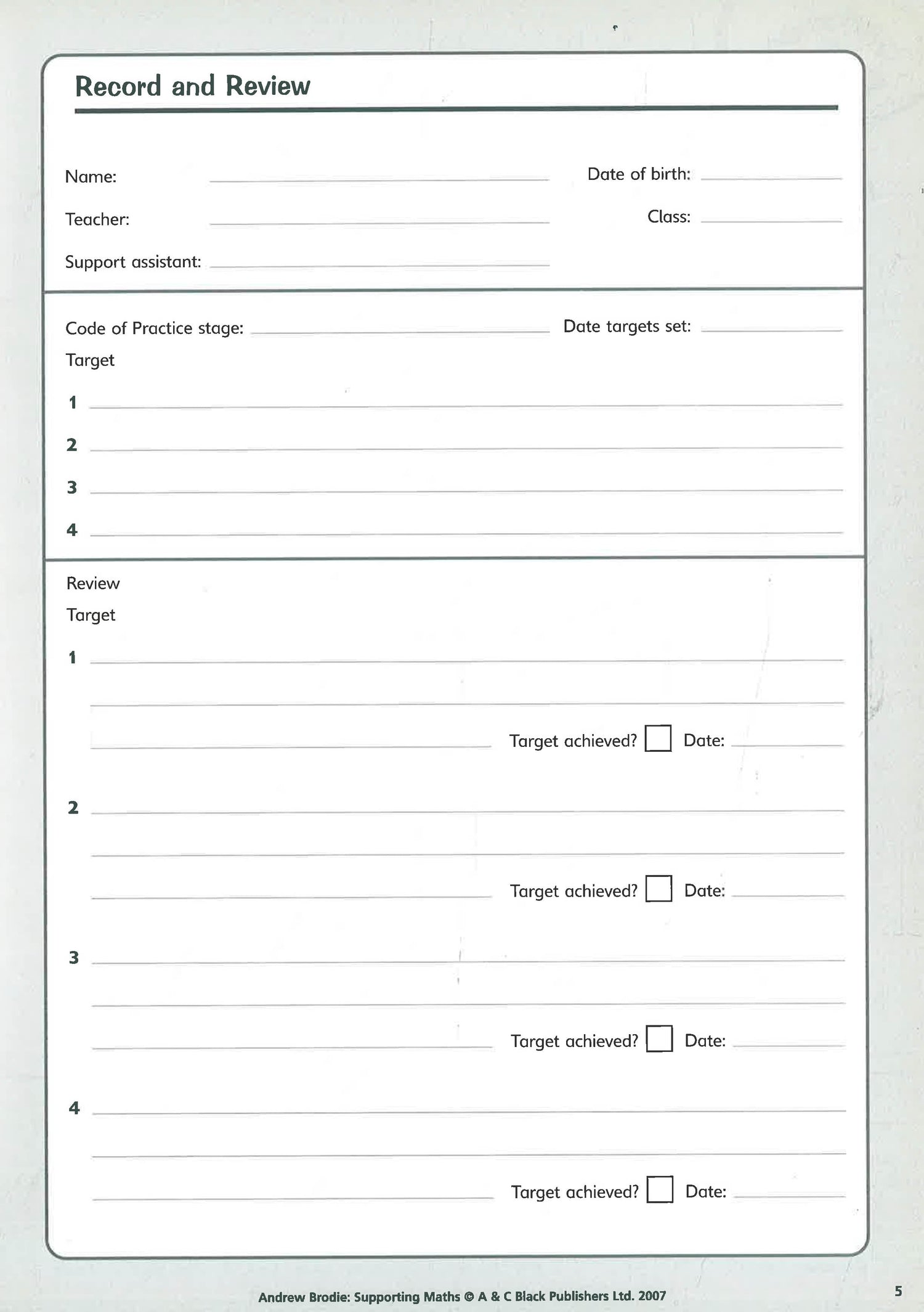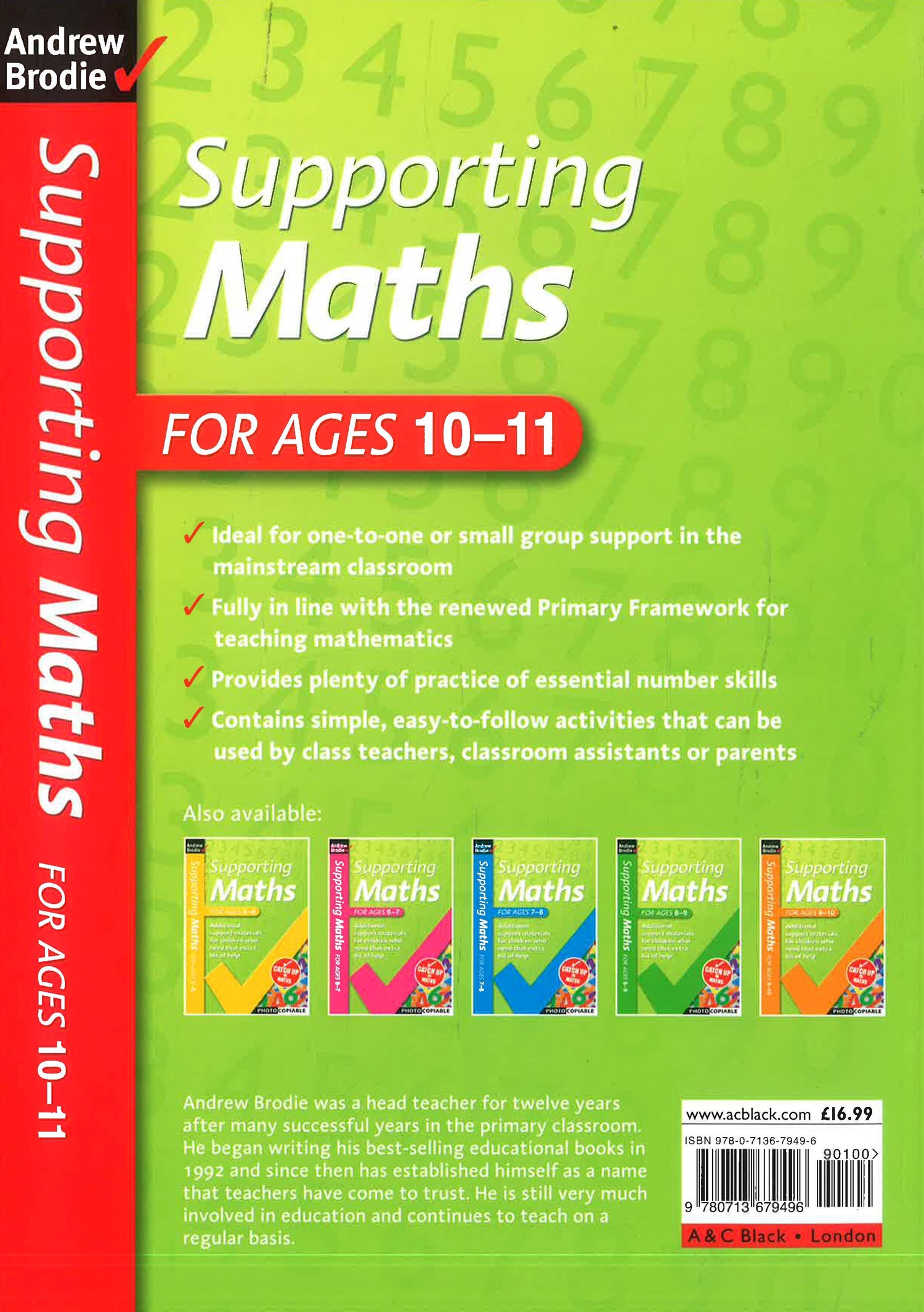 An excellent new series of photocopiable maths activities from Andrew Brodie specifically written for lower ability children in mainstream classrooms who need 'additional' or 'different' help. (One in six children fall into this category). This series of 6 titles (one for each year group) is designed for class teachers and also for classroom assistants. Every primary school now employs several assistants and their status and role is growing enormously. Supporting Mathematics has clearly laid out activities that focus on particular learning 'targets' that have been carefully selected and researched by the author team. All lower ability children are given targets to achieve and these books will feature the targets that are common to most schools and most children.
