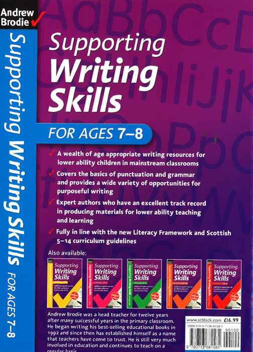 This series, like Supporting Literacy, builds on Andres Brodie's aptitude for making things really straightforward for less able pupils. Teachers need materials that are suitable for the increasing number of lower ability children in the mainstream classroom. These children who need 'additional' or 'different' help (roughly one in six children fall into this category), are often supervised by classroom assistants. National Test results indicate that children, especially boys, are struggling with their writing. 'One in five children who enter secondary school are officially behind in reading and writing.' Inspectors also reported on the continuing gap between girls and boys, which they say is particularly pronounced in writing. All activities are linked to the new Literacy framework through a process of 'tracking back' and are intended to help lower ability pupils make progress in order to catch up with their year group. Each learning objective is addressed by one or more pages and each page will include notes for teachers enabling anyone using the sheet to see its purpose immediately. Recording and monitoring pupil's progress are integral to all books.