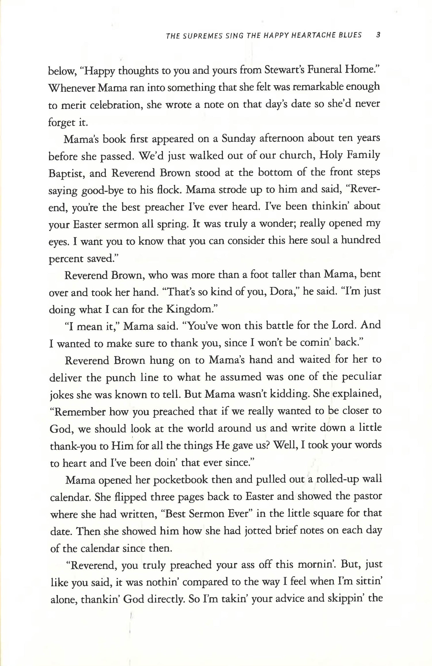 But El is not the only Plainview native with a hurdle to overcome. A wildly philandering husband struggles at last to prove his faithfulness to the wife he’s always loved. And among those in this tightly knit community who show up every Sunday after church for lunch at Earl’s All-You-Can-Eat, are the lifelong friends, known locally as “The Supremes” —Clarice, facing down her longing for, chance at and fear of a great career; Barbara Jean, grappling at last with the loss of a mother whose life humiliated both of them, and Odette, reaching toward her husband through an anger of his that she does not understand.