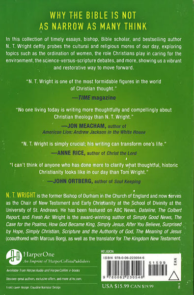 An unusual combination of scholar, churchman, and leader, N. T. Wright--hailed by Newsweek as "the world's leading New Testament scholar"--is not only incredibly insightful, but conveys his knowledge in terms that excite and inspire Christian leaders worldwide, allowing them to see the Bible from a fresh viewpoint. In this challenging and stimulating collection of popular essays, sermons, and talks, Wright provide a series of case studies which explore how the Bible can be applied to some of the most pressing contemporary issues facing us, including: Why it is possible to love the Bible and affirm evolution Why women should be allowed to be ordained Where Christians today have lost focus, and why it is important for them to engage in politics--and why that involvement benefits everyone Why the Christian belief in heaven means we should be at the forefront of the environmental movement And much more