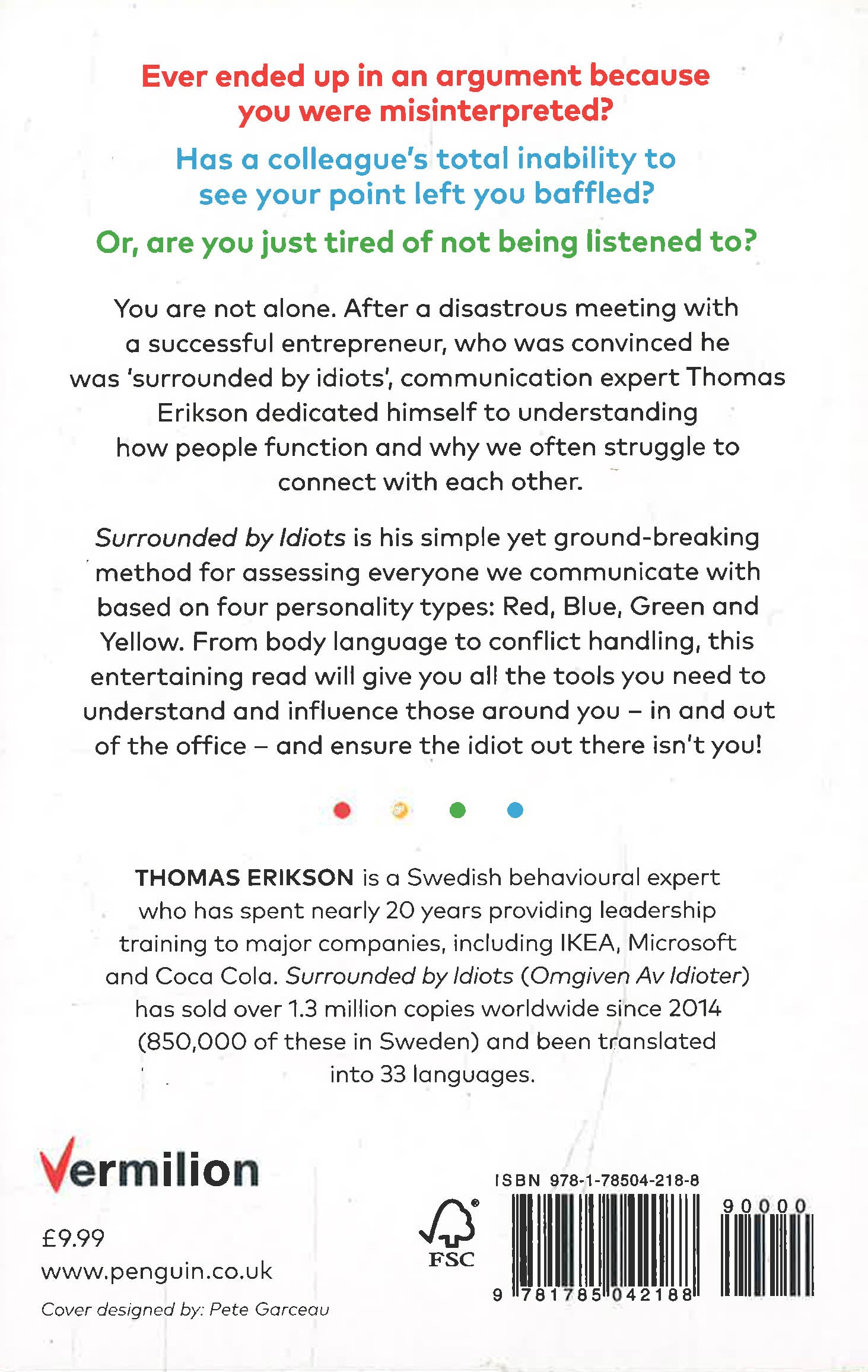 Originally published in Swedish in 2014 as Omgiven Av Idioter, Erikson's Surrounded by Idiots is already an international phenomenon, selling over 1.5 million copies worldwide, of which over 750,000 copies have been sold in Sweden alone. It offers a simple, yet ground-breaking method for assessing the personalities of people we communicate with - in and out of the office - based on four personality types (Red, Blue, Green and Yellow), and provides insights into how we can adjust the way(s) we speak and share information.