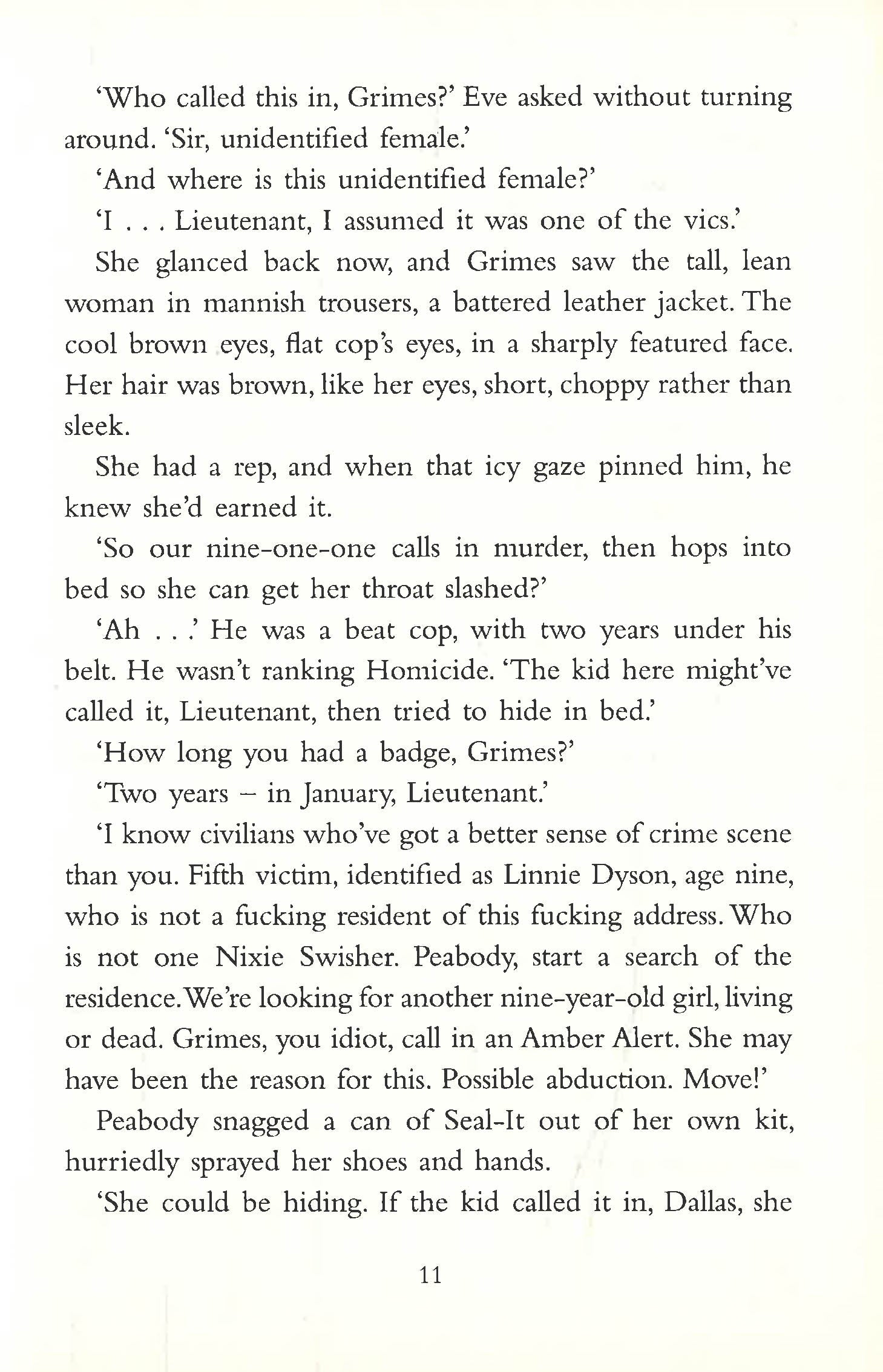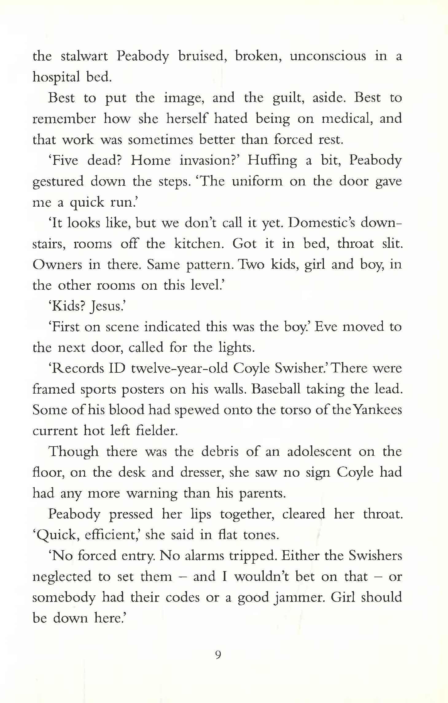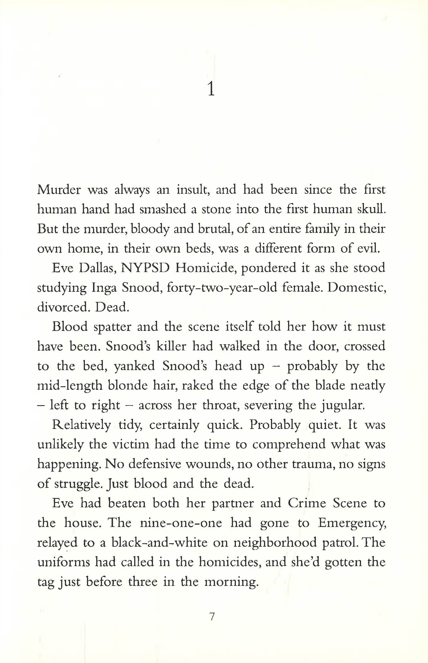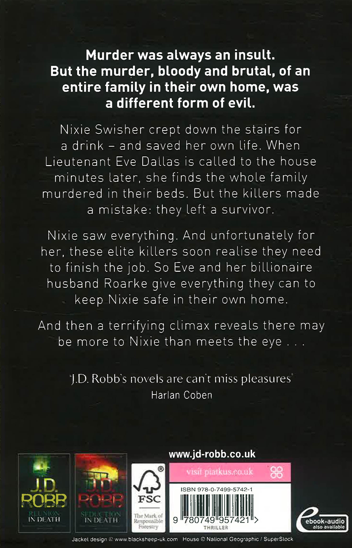 Nixie Swisher crept down the stairs for a drink - and saved her own life. When Lieutenant Eve Dallas is called to the house minutes later, she finds the whole family murdered in their beds. But the killers made a mistake: they left a survivor.