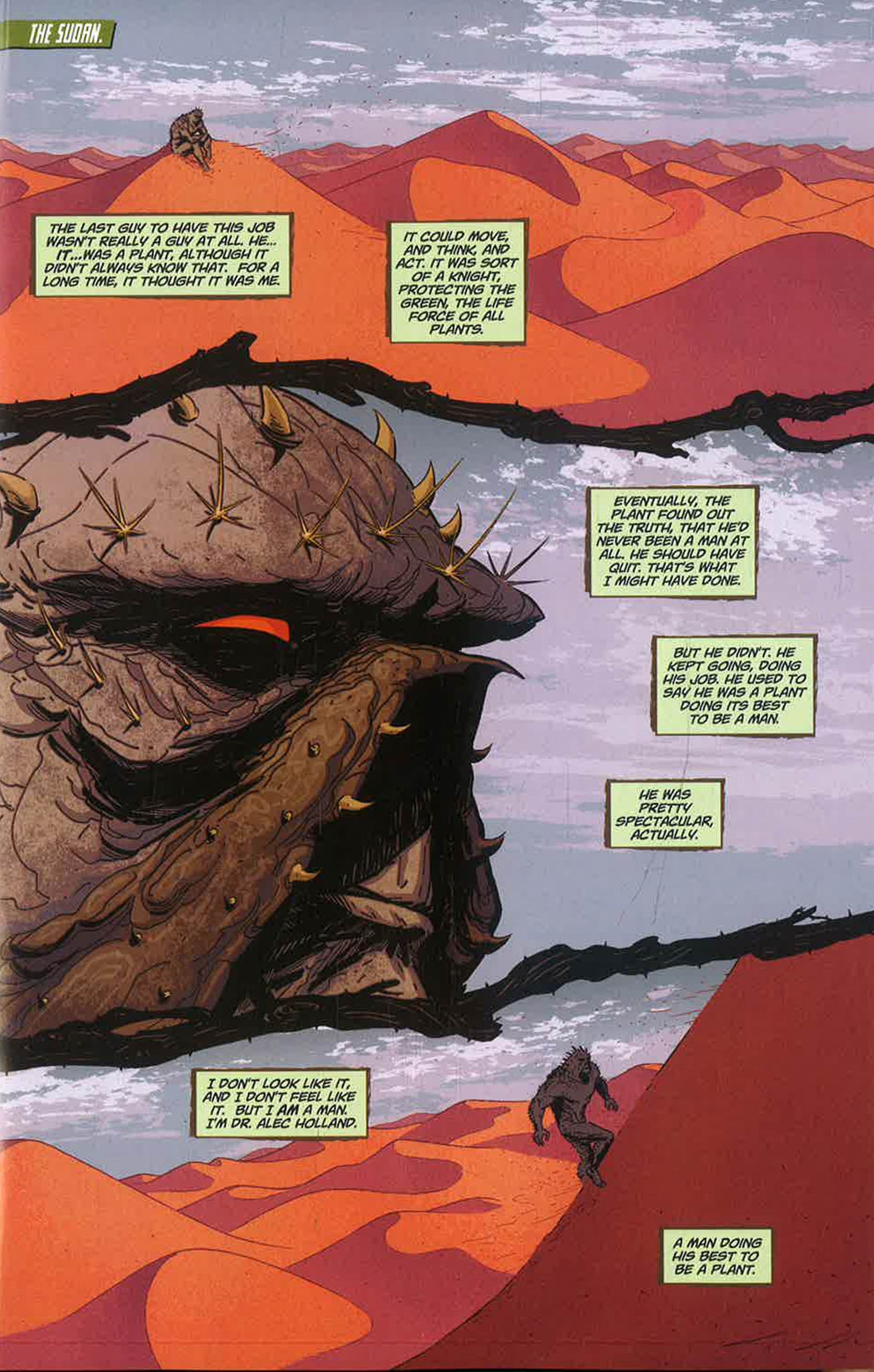 Fetters Hill was once a thriving Scottish town whose inhabitants relied on the riches of their whiskey distillery to support themselves. Once closed, Fetters Hill began a slow decline, until a mysterious stranger by the name of Seeder arrives in the desperate town with a gift: a tree that bears whiskey like fruit. It's a disturbance in the natural order of "the green" that draws the Swamp Thing's attention as well as John Constantine. The newfound joy in Fetters Hill may be shortlived, since the gifts of Seeder always come with a price.