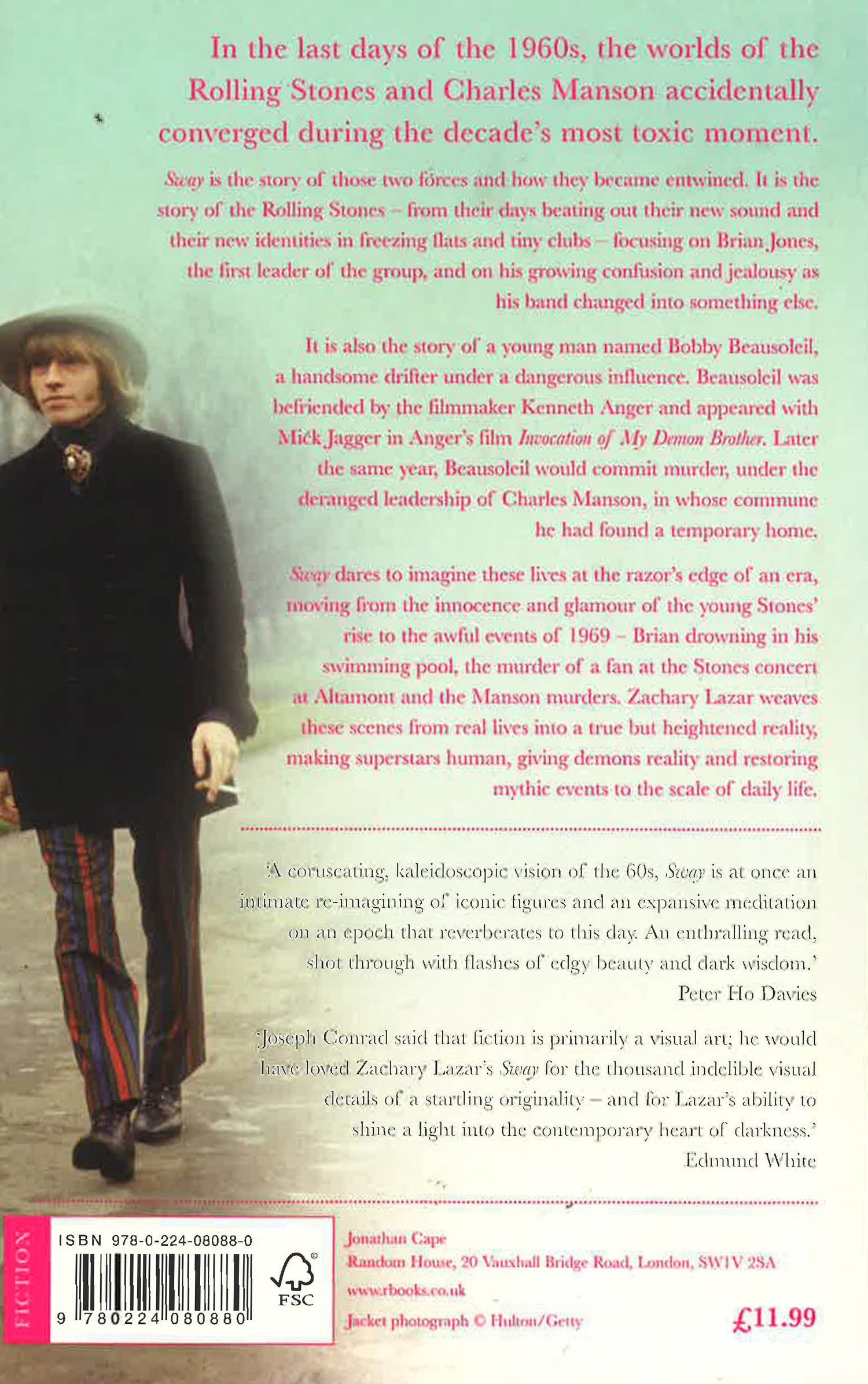 By the end of the sixties, 'the decade itself knows that it can never return, that it has only this one chance to live up to its own extremes,' as Zachary Lazar writes in his extraordinary new novel. Three dramatic and emblematic stories intertwine in "Sway" - the early days of the Rolling Stones, including the romantic triangle of Brian Jones, Anita Pallenberg and Keith Richards; the life of avant-garde filmmaker Kenneth Anger; and the community of Charles Manson and his followers.Lazar illuminates a particular hour in American history when rapture found its roots in idolatrous figures and led to unprovoked and inexplicable violence. Running through all the life stories in this novel is Bobby Beausoleil, a beautiful Californian boy, who eventually joined the Manson 'family'. In 1969 he appeared - along with the Stones - and various "Hell's Angels" - in Anger's film, "Invocation of My Demon Brother". In "Sway", Bobby is the embodiment of how a rising tide of suppressed conflict and debauchery needed, among other things, real devils, like Manson, and iconic ones, like Mick Jagger, to permit its expression.