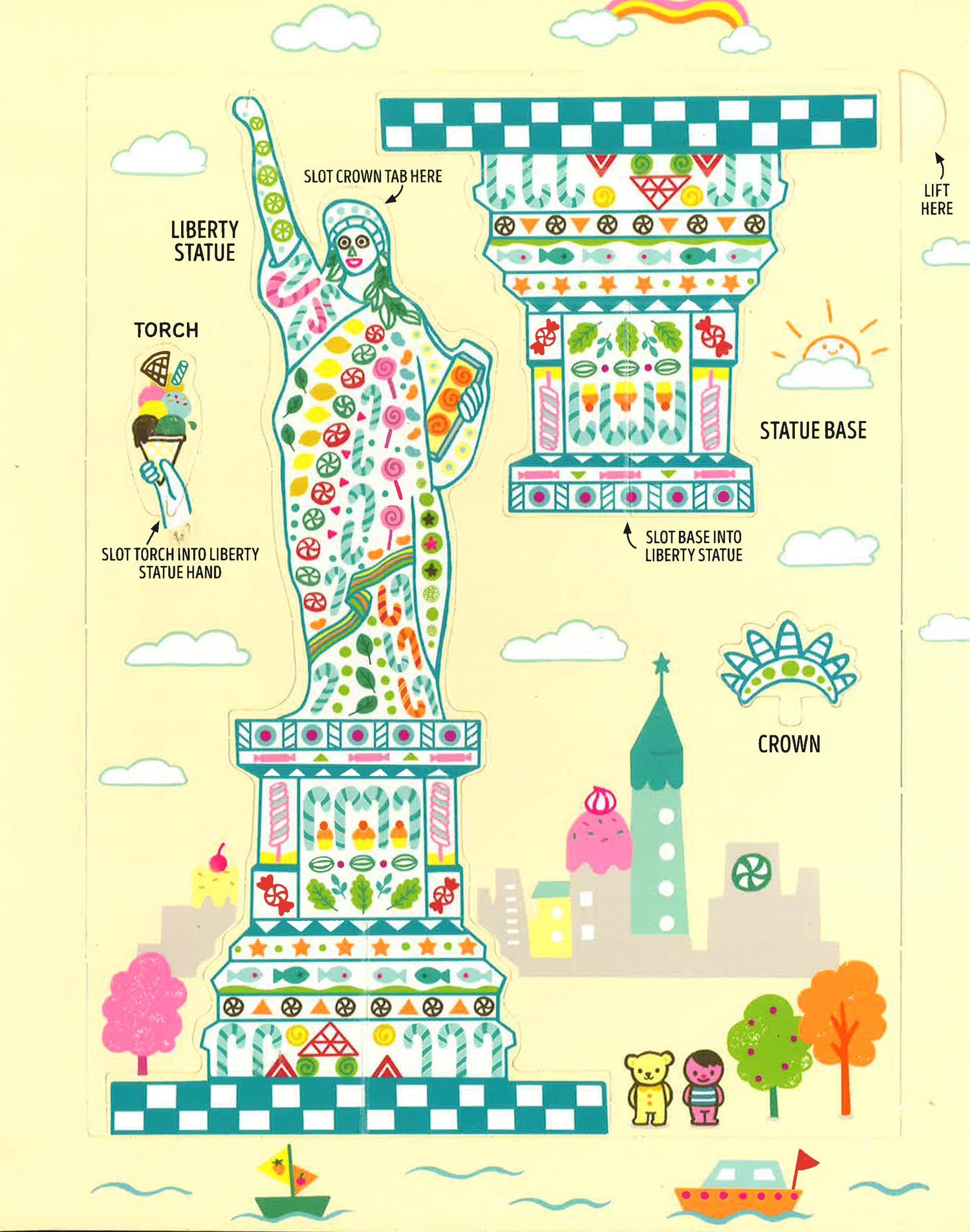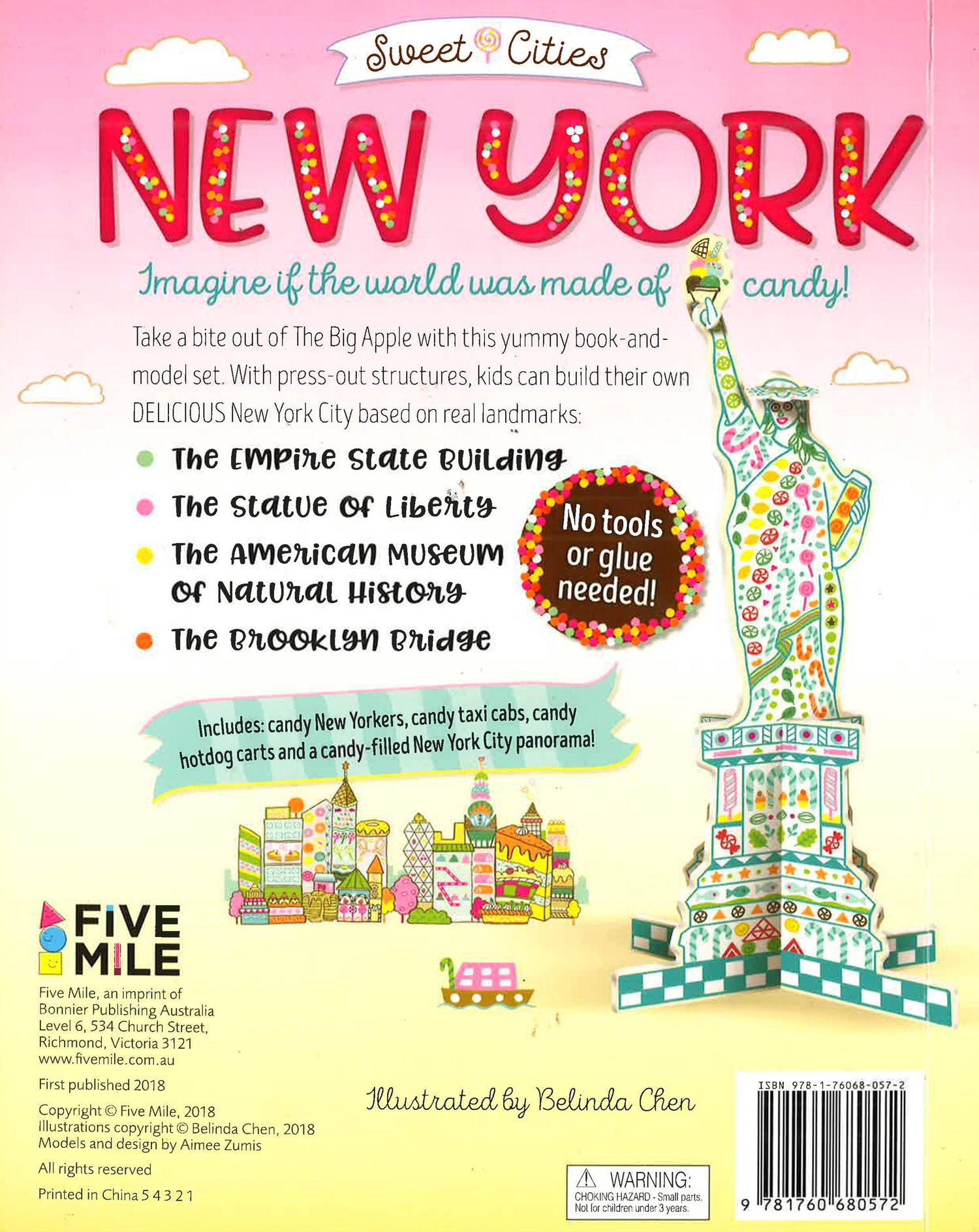 Take a bite out of The Big Apple with this delicious book and play-set. With press-out structures, kids can build their own delicious New York City based on real landmarks: Empire State Building, Statue of Liberty, American Museum of Natural History, Brooklyn Bridge. Includes candy New Yorkers, candy taxi cabs, candy hotdog carts and a candy-filled New York City panorama!