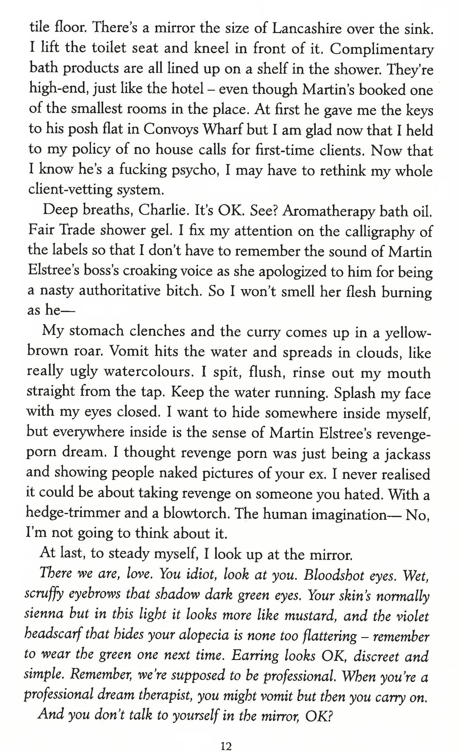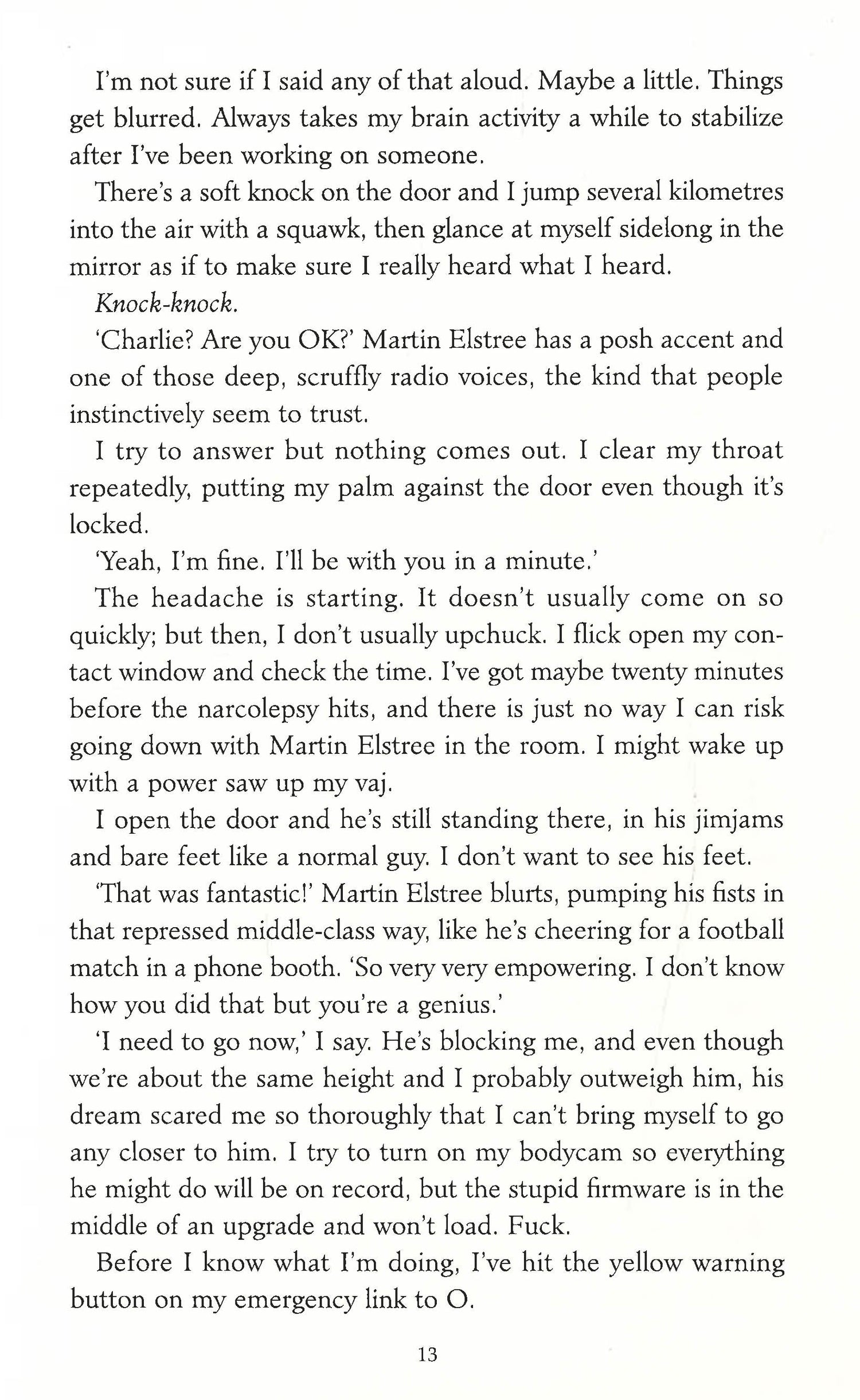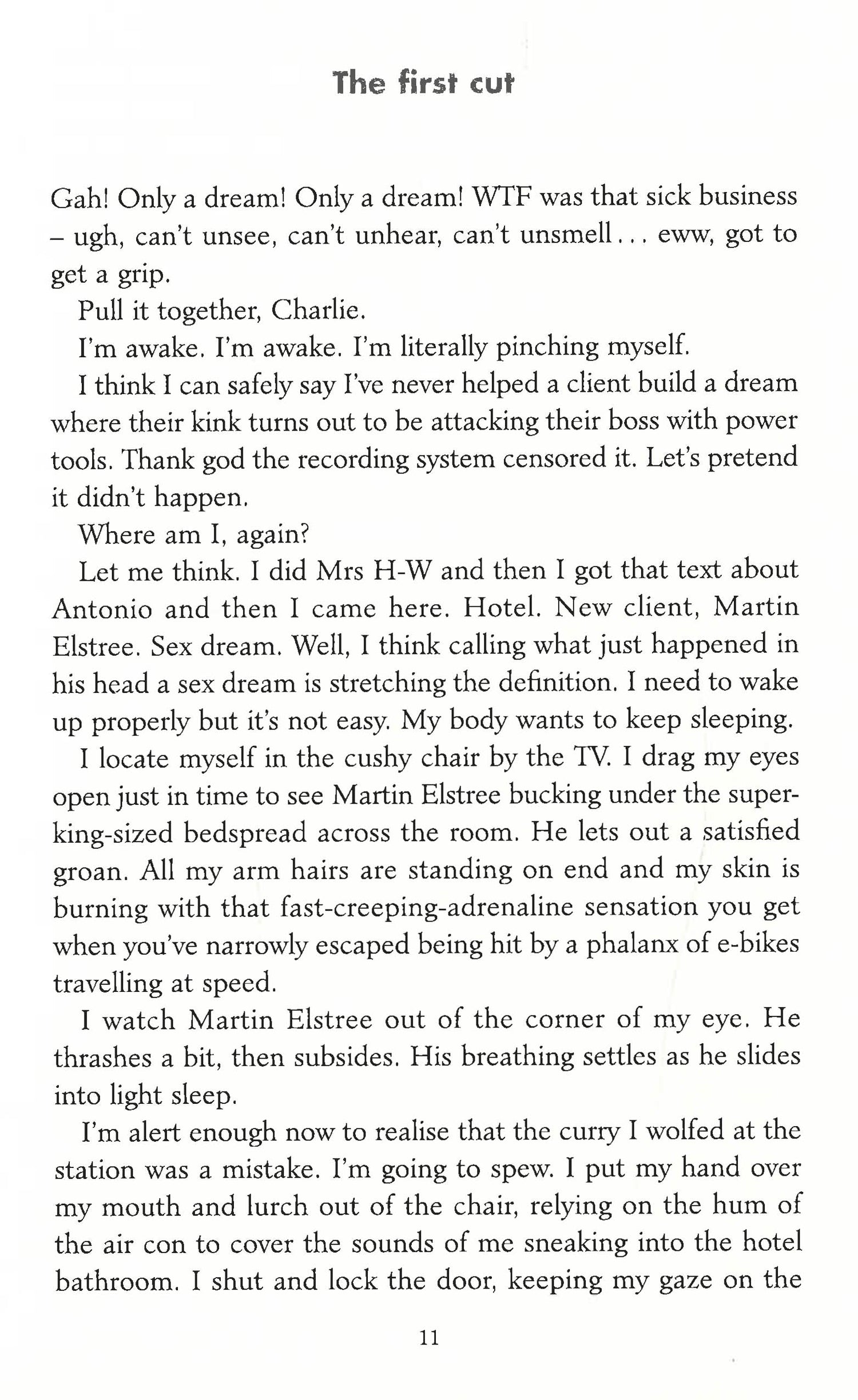 Charlie is a dreamhacker, able to enter your dreams and mould their direction. Forget that recurring nightmare about being naked at an exam - Charlie will step in to your dream, bring you a dressing gown and give you the answers. As far as she knows, she's the only person who can do this. Unfortunately, her power comes with one drawback - Charlie also has narcolepsy, and may fall asleep at the most inopportune moment. But in London 2022, her skill is in demand. And when she is hired by a minor celebrity - who also happens to be the new girlfriend of Charlie's lamented ex - who dreams of a masked Creeper then sleepwalks off a tall building, Charlie begins to realise that someone else might be able to invade dreams...