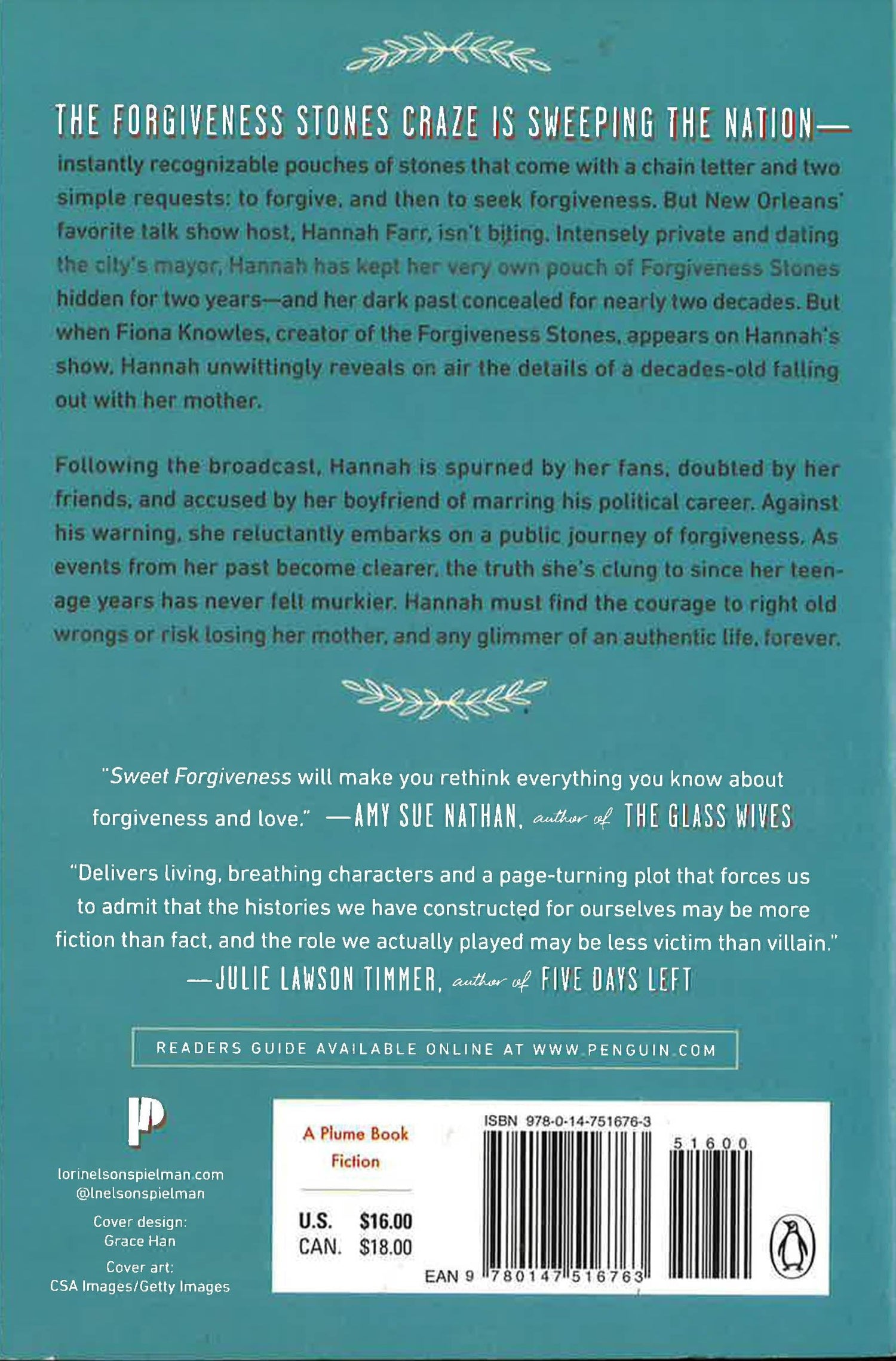 #1 international bestselling author Lori Nelson Spielman follows The Life List with Sweet Forgiveness, in which a woman's receipt of two "forgiveness stones" sends her searching for atonement The Forgiveness Stones craze is sweeping the nation--instantly recognizable pouches of stones that come with a chain letter and two simple requests: to forgive, and then to seek forgiveness. But New Orleans' favorite talk show host, Hannah Farr, isn't biting. Intensely private and dating the city's mayor, Hannah has kept her very own pouch of Forgiveness Stones hidden for two years--and her dark past concealed for nearly two decades. But when Fiona Knowles, creator of the Forgiveness Stones, appears on Hannah's show, Hannah unwittingly reveals on air details of a decades-old falling out with her mother. Spurned by her fans, doubted by her friends, and accused by her boyfriend of marring his political career, Hannah reluctantly embarks on a public journey of forgiveness. As events from her past become clearer, the truth she's clung to since her teenage years has never felt murkier. Hannah must find the courage to right old wrongs, or risk losing her mother, and any glimmer of an authentic life, forever.