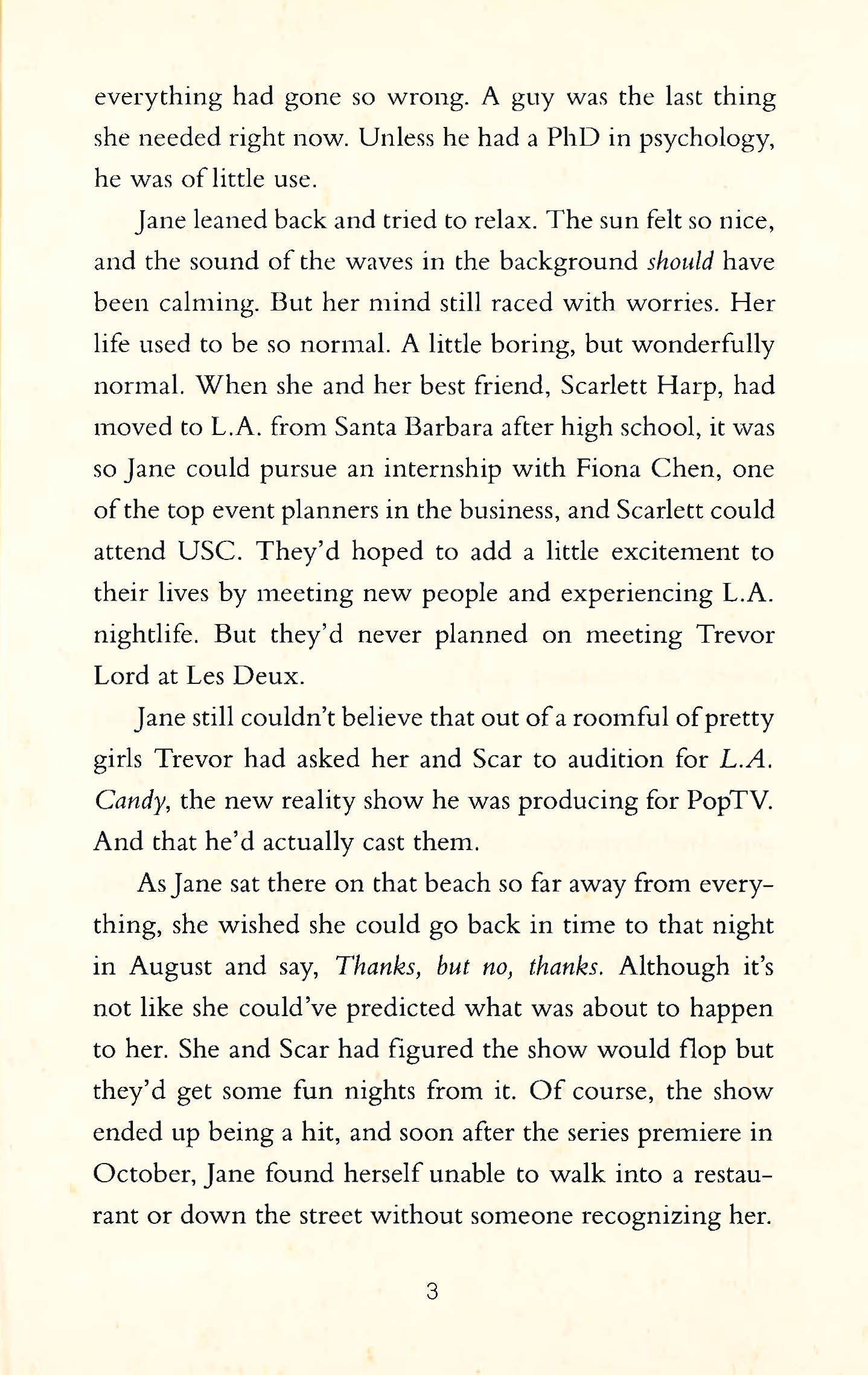 Jane Roberts was the average girl next door until she and her best friend, Scarlett Harp, landed their own reality show, L.A. Candy. Now the girls have an all-access pass to Hollywood's hottest everything. But there's more to life on camera than just parties and shopping. . . . When racy photos of Jane are leaked to the press, she finds herself at the center of a tabloid scandal. She turns to her co-star Madison Parker for help, unaware that Madison is scheming behind the scenes. She might be Jane's shoulder to cry on, but does Madison really have Jane's back? Scarlett's working on a scandal of her own. She's fallen for someone who's strictly off-limits - which means Scarlett has a big secret to keep . . . from the L.A. Candy cameras, the paparazzi staking out her apartment, even from her best friend. Of course, nothing stays secret for long for the stars of the newest hit TV series, and all this drama couldn't be better for ratings