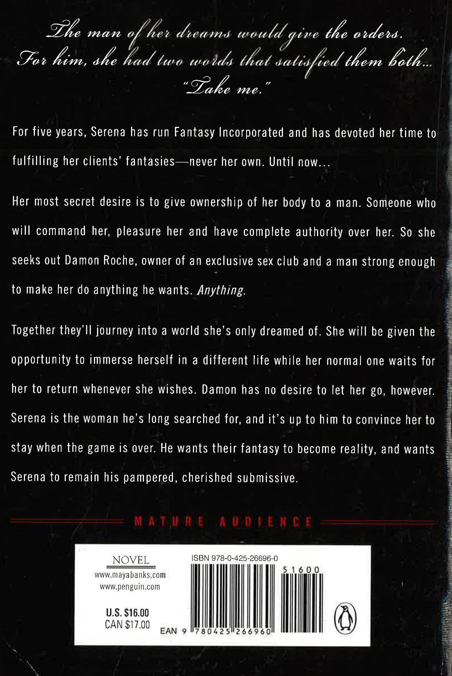 FROM NEW YORK TIMES BESTSELLING AUTHOR OF THE BREATHLESS TRILOGY MAYA BANKS The man of her dreams would give the orders. For him, she had two words that satisfied them both..."Take me." For five years, Serena has run Fantasy Incorporated and has devoted her time to fulfilling her clients' fantasies. Never her own. Until now... Her most secret desire is to give ownership of her body to a man. Someone who will command her, pleasure her, and have complete authority over her. So she seeks out Damon Roche, owner of an exclusive sex club and a man strong enough to make her do anything he wants. Anything. Together they'll journey into a world she's only dreamed of. She's given the opportunity to immerse herself in a different life while her normal one waits for her to return whenever she wishes. Damon has no desire to let her go, however. Serena is the woman he's long searched for, and it's up to him to convince her to stay when the game is all over with. He wants their fantasy to become their reality and for Serena to remain his pampered, cherished submissive.