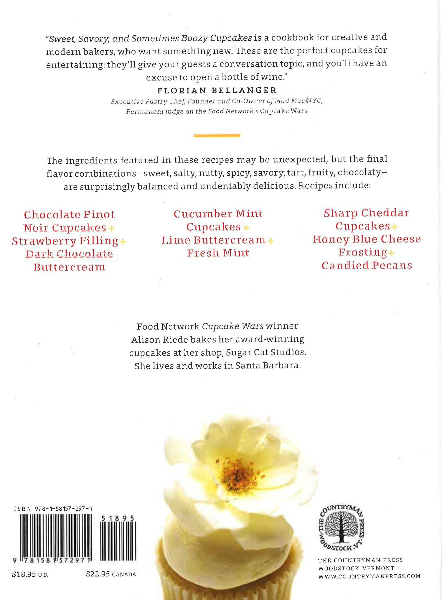 Europeans serve savory cheese after a nice meal. Americans prefer something sweet and sugary. Alison Riede manages to marry the two concepts with her wildly original and surprisingly delicious cupcakes. She starts with the flavors and winds up with something that defies expectation. Recipes for salty, nutty, spicy, savory, tart, fruity, and chocolaty desserts include: Lemon Olive Oil Cupcakes with Sage and Sea Salt Buttercream Rosemary Parmesan Cupcakes with Lemon Cream Cheese Frosting and Toasted Almonds Cucumber Mint Cupcakes with Lime Buttercream and Fresh Mint Banana Cupcakes with Mango Filling and Banana Rum Frosting Chocolate Pinot Noir Cupcakes with Strawberry Filling and Dark Chocolate Pinot Buttercream One taste and it will be clear why Cupcake Wars handed her the crown. Her recipes are simple and straightforward, illustrated with mouthwatering photographs. This is a truly original winner of a cookbook.