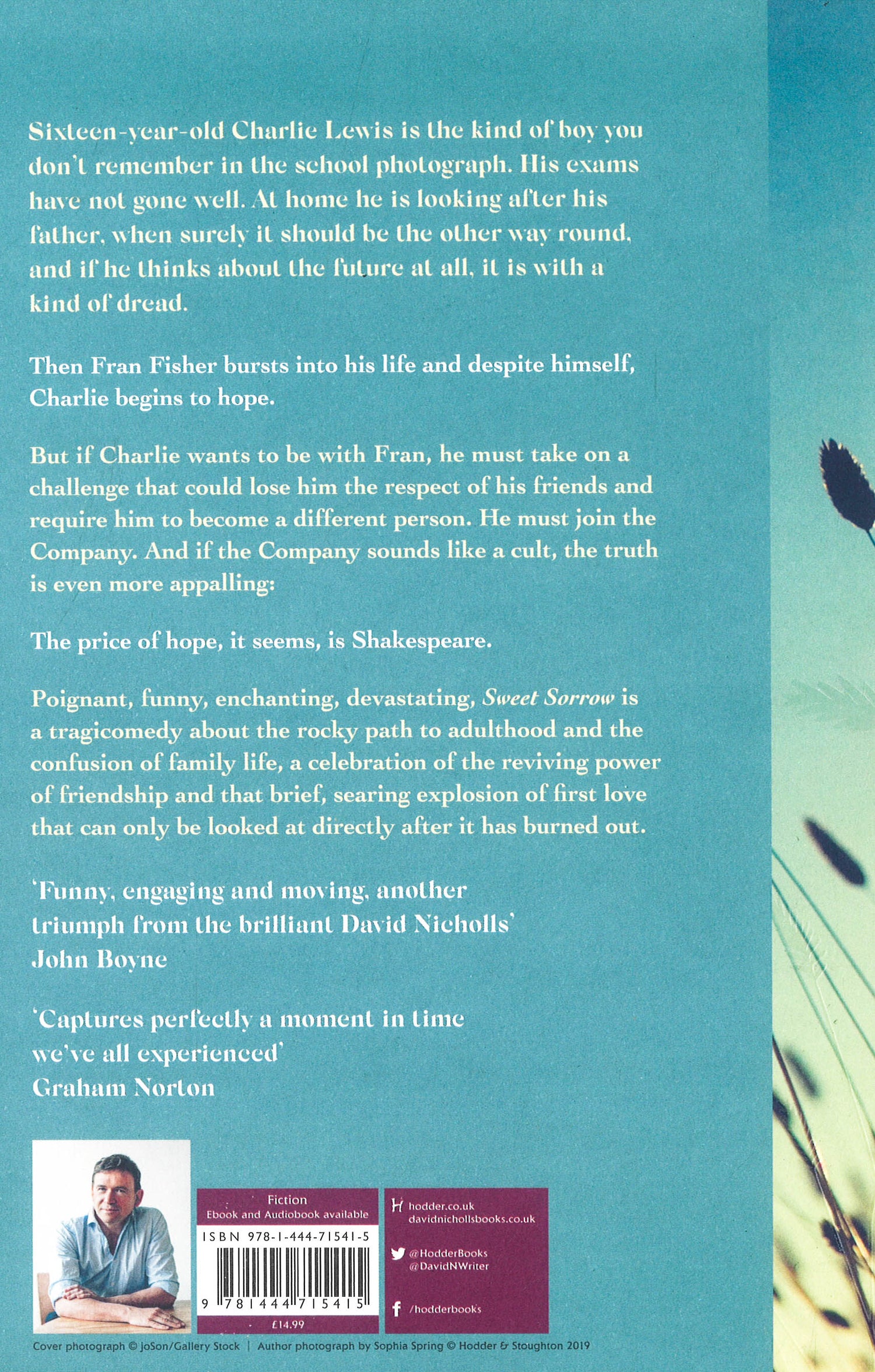 The major new novel from David Nicholls.THE SUNDAY TIMES BESTSELLER 'That most rare and coveted of literary feats: a popular novel of serious merit, a bestseller that will also endure.' Observer'Triumph ... the sense of nostalgia is visceral and intense, almost time-bending.' The Sunday Times 'Pitch perfect ... Exquisite ... Terrific ... Very funny ... Though Sweet Sorrow is certainly pulse-quickening enough to absorb readers through this summer's airport delays and rained-off beach days, it's no escapist fantasy. The tale of Charlie and Fran will linger long beyond your tan.' TelegraphOne life-changing summerCharlie meets Fran...In 1997, Charlie Lewis is the kind of boy you don't remember in the school photograph. His exams have not gone well. At home he is looking after his father, when surely it should be the other way round, and if he thinks about the future at all, it is with a kind of dread.Then Fran Fisher bursts into his life and despite himself, Charlie begins to hope.But if Charlie wants to be with Fran, he must take on a challenge that could lose him the respect of his friends and require him to become a different person. He must join the Company. And if the Company sounds like a cult, the truth is even more appalling.The price of hope, it seems, is Shakespeare.Poignant, funny, enchanting, devastating, Sweet Sorrow is a tragicomedy about the rocky path to adulthood and the confusion of family life, a celebration of the reviving power of friendship and that brief, searing explosion of first love that can only be looked at directly after it has burned out. 'A compassionate, intelligent look at the raw pain and loneliness of a teenage boy, the everyday miracle of first love and the perennial power of Shakespeare's language.' Spectator 'A superbly written, beautifully observed account of teenage life, love, family dysfunction and friendship, which builds to a stunningly poignant ending.' Heat 'The author of Us and of course One Day has never written with more tenderness and insight than in this bittersweet story ... perfectly captures the dizzying highs and lows of first love.' Daily Express 'Such a beautiful book. Captures perfectly a moment in time we've all experienced.' Graham Norton