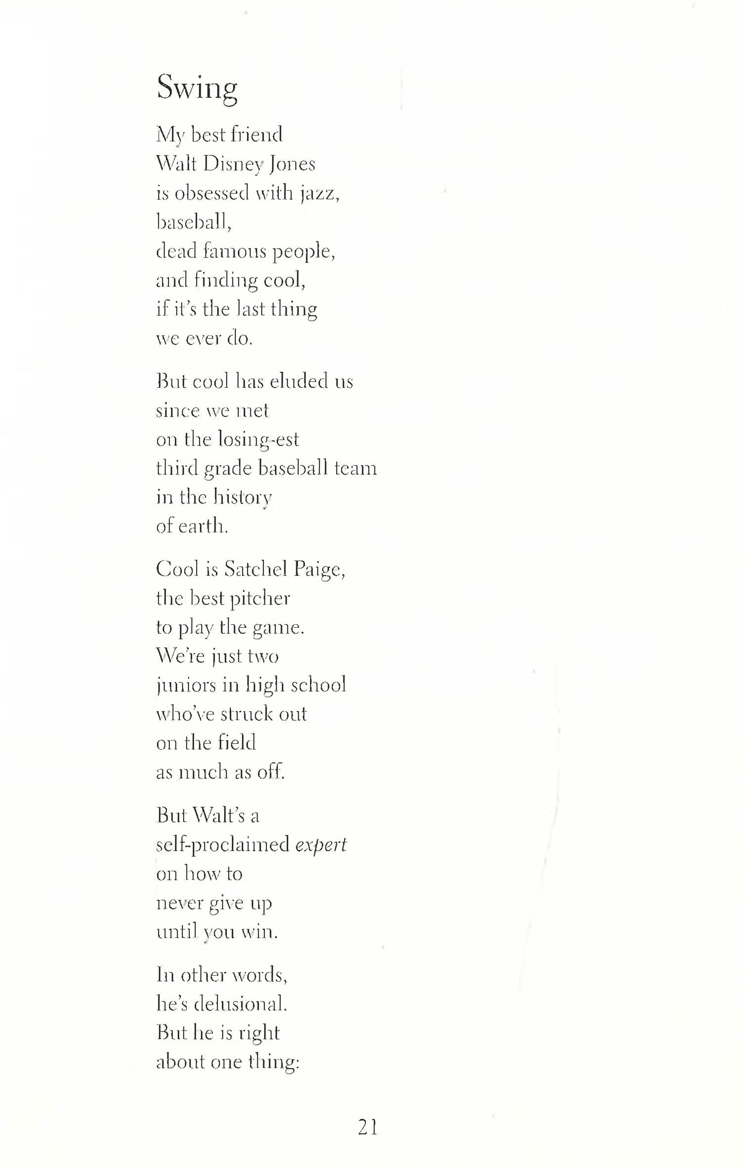 New York Times bestselling authors Kwame Alexander and Mary Rand Hess (Solo) tell this lyrical story about hope, courage, and love that speaks to anyone who's struggled to find their voice. And the surprise ending shines a spotlight on the issues related to our current social divide, challenging perspectives and inspiring everyone to make their voice heard. When America is not so beautiful, or right, or just, it can be hard to know what to do. Best friends Walt and Noah decide to use their voices to grow more good in the world, but first they've got to find cool. Walt is convinced junior year is their year, and he has a plan to help them woo the girls of their dreams and become amazing athletes. Never mind that he and Noah failed to make the high school baseball team yet again, and Noah's love interest since third grade, Sam, has him firmly in the friend zone. Noah soon finds himself navigating the worlds of jazz, batting cages, the strange advice of Walt's Dairy Queen-employed cousin, as well as Walt's "Hug Life" mentality. Status quo seems inevitable until Noah stumbles on a stash of old love letters. Each page contains the words he's always wanted to say to Sam, and he begins secretly creating artwork using the lines that speak his heart. But when his private artwork becomes public, Noah has a decision to make: continue his life in the dugout and possibly lose the girl forever, or take a swing and finally speak out? At the same time, numerous American flags are being left around town. While some think it's a harmless prank and others see it as a form of peaceful protest, Noah can't shake the feeling something bigger is happening to his community. Especially after he witnesses events that hint divides and prejudices run deeper than he realized. As the personal and social tensions increase around them, Noah and Walt must decide what is really true when it comes to love, friendship, sacrifice, and fate. Swing: Is written by New York Times bestselling author and Newbery Medal and Coretta Scott King Honor Book Award-winner Kwame Alexander Is a young adult fiction novel told through Kwame's one-of-a-kind free-verse poetry Is ripe with themes of hope, courage, and love Masterfully combines jazz, art, baseball, friendship, and love into what many are calling "Kwame's best book yet" Tackles some of the most painful social issues of today, including racial prejudice 2020 YALSA Quick Pick for Reluctant Young Adult Readers