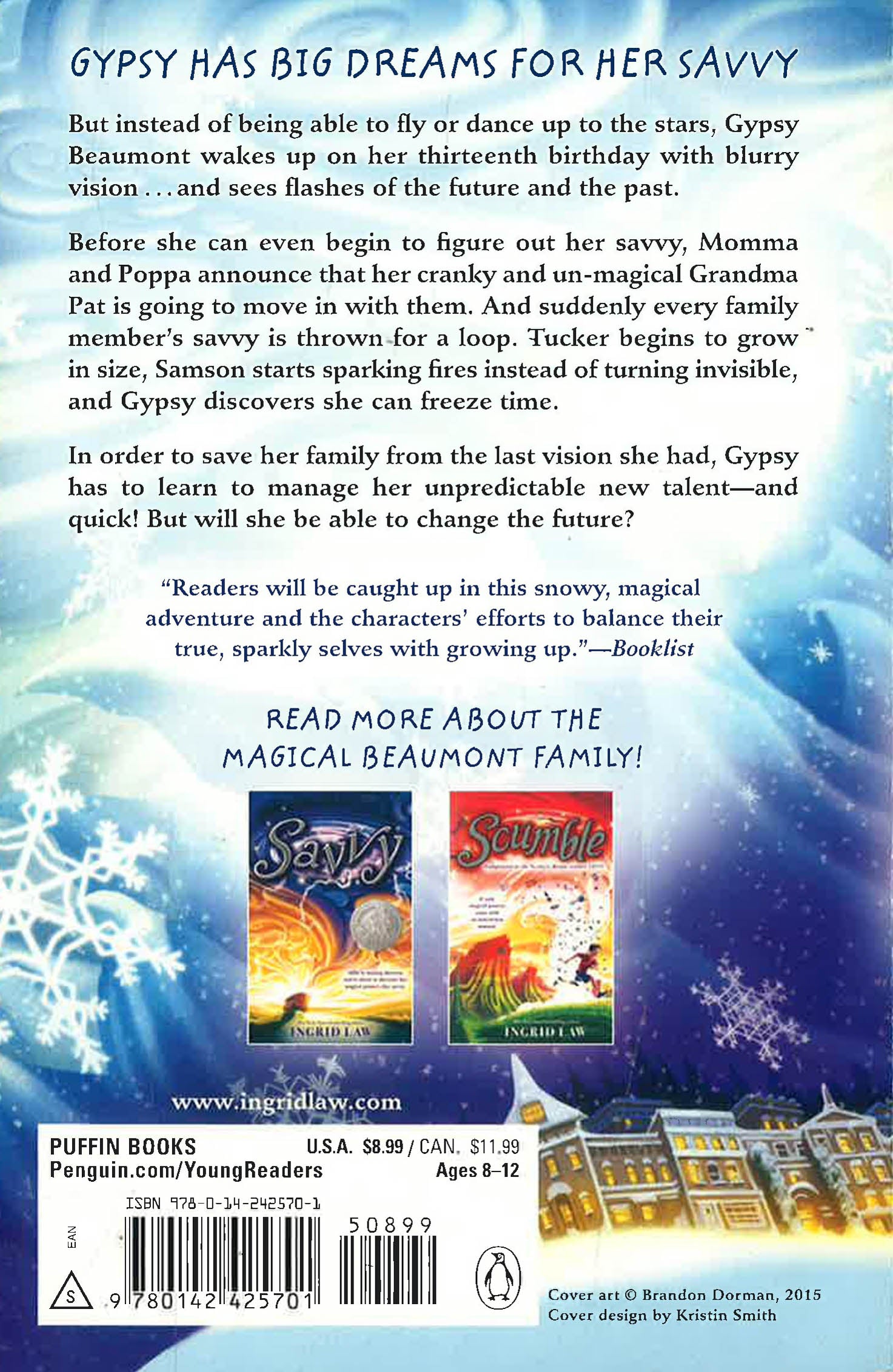Ingrid Law delivers another heartwarming story about the magic of friendship and the power of family in this companion to her Newbery Honor-winning Savvy Gypsy Beaumont has always been a whirly-twirly free spirit, so as her thirteenth birthday approaches, she hopes to get a magical ability that will let her fly, or dance up to the stars. Instead, she wakes up on her birthday with blurry vision . . . and starts seeing flashes of the future and past. But when Momma and Poppa announce that her very un-magical, downright mean Grandma Pat has Alzheimer's and is going to move in with them, Gypsy's savvy--along with her family's--suddenly becomes its opposite. Now it's savvy mayhem as Gypsy starts freezing time, and no one could have predicted what would happen on their trip to bring Grandma Pat home . . . not even Gypsy. With her trademark style and whimsical, beautiful language, Ingrid Law has written another wonderfully moving companion to her Newbery Honor-winning Savvy. *This book may have remainder mark*