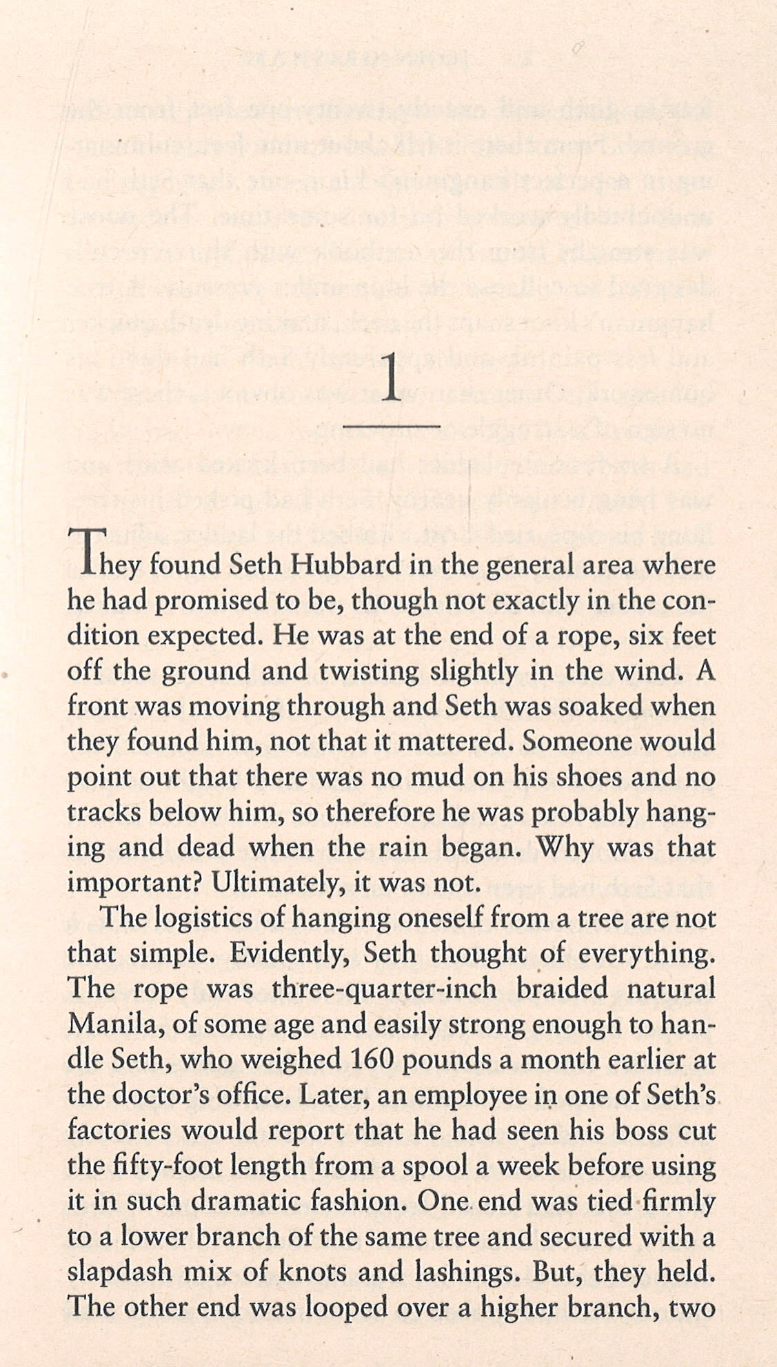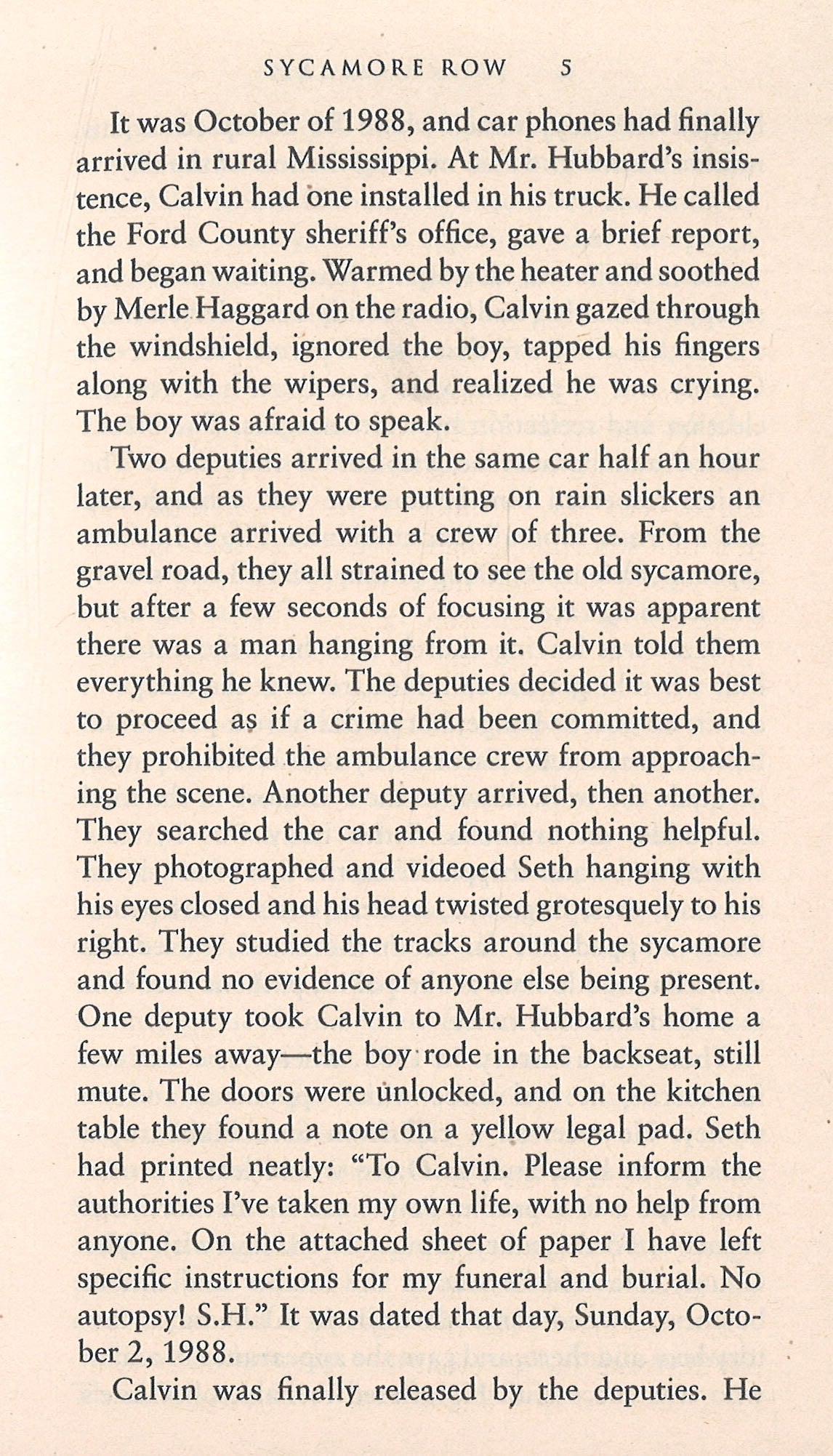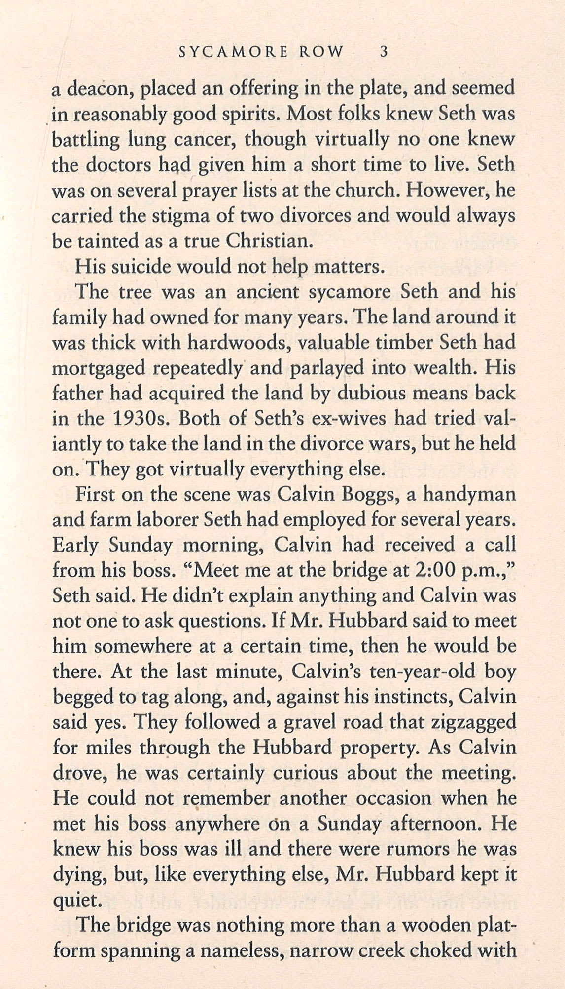 Seth Hubbard is a wealthy man dying of lung cancer. He trusts no one. Before he hangs himself from a sycamore tree, Hubbard leaves a new, handwritten will. It is an act that drags his adult children, his black maid, and Jake into a conflict as riveting and dramatic as the murder trial that made Brigance one of Ford County’s most notorious citizens, just three years earlier. The second will raises many more questions than it answers. Why would Hubbard leave nearly all of his fortune to his maid? Had chemotherapy and painkillers affected his ability to think clearly? And what does it all have to do with a piece of land once known as Sycamore Row?
