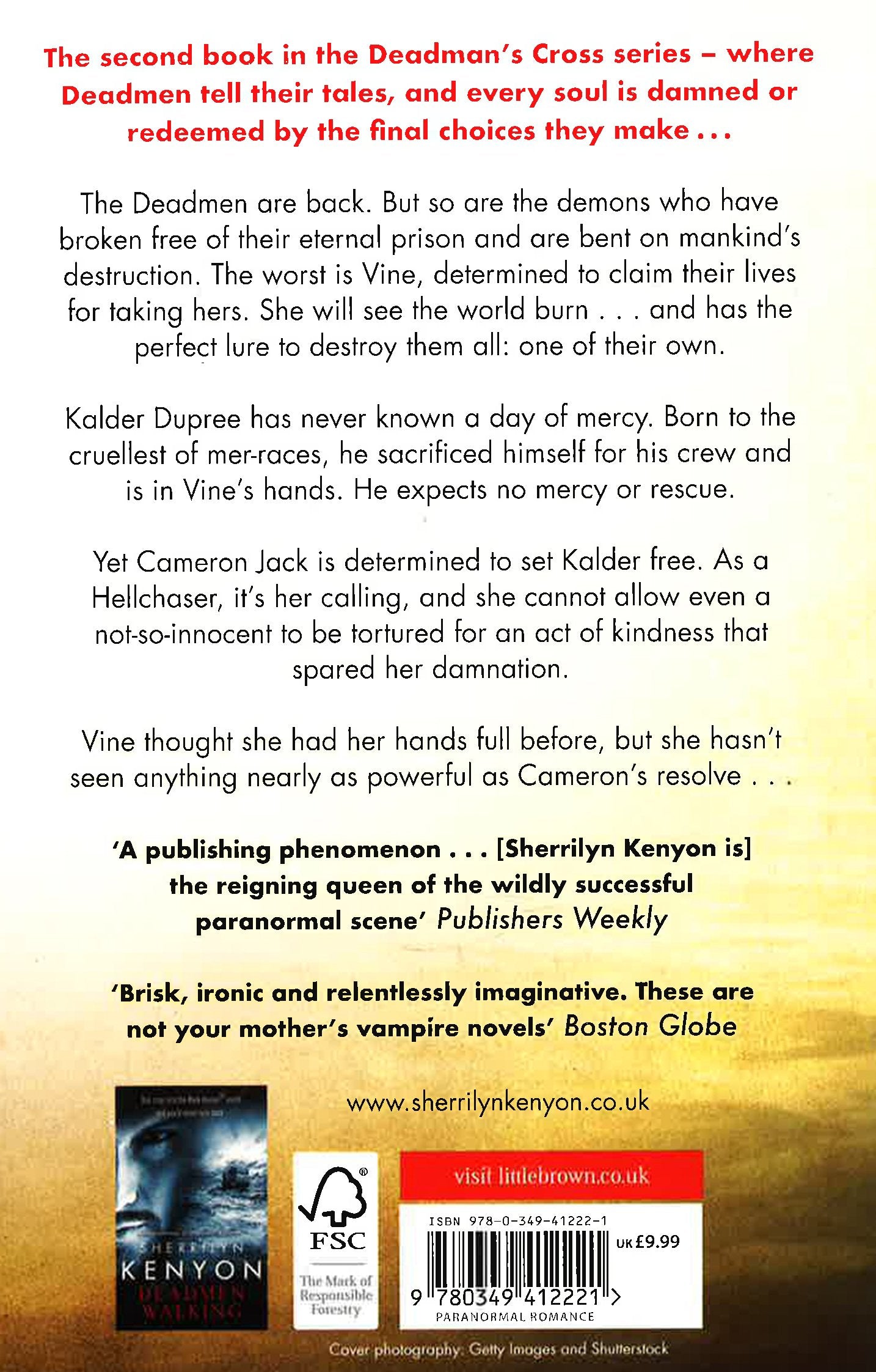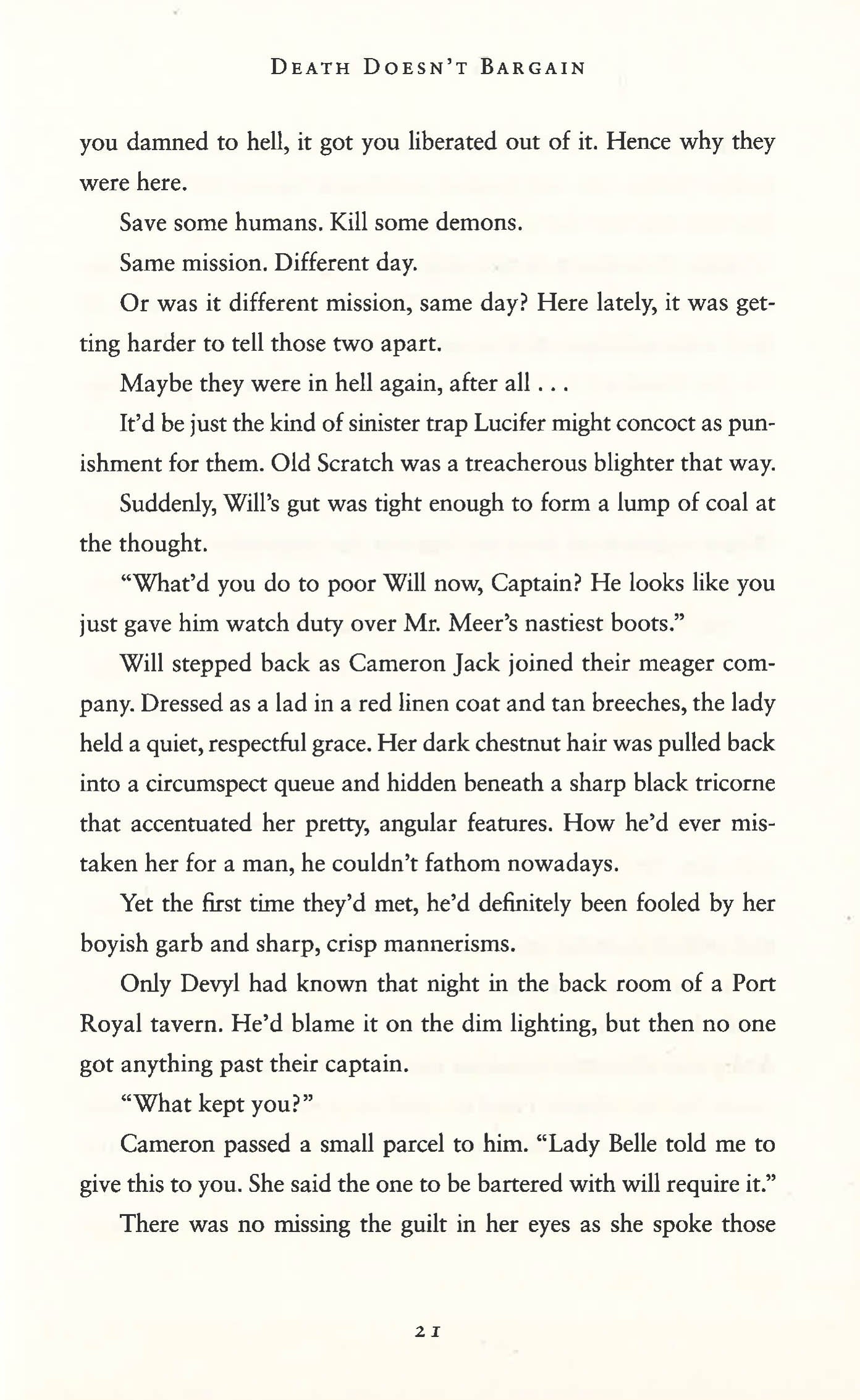 But so are the demons who have broken free of their eternal prison and are bent on mankind's destruction. The worst of the lot is Vine, determined to claim their lives for taking hers. She will see the world burn . . . and has the perfect lure to destroy them all. One of their own.Kalder Dupree has never known a day of mercy. Born to the cruelest of mer-races, he sacrificed himself for his crew and is in Vine's hands. He expects no mercy or rescue.Yet Cameron Jack is determined to set Kalder free. As a Hellchaser, it's her calling, and she cannot allow even a not-so-innocent to be tortured for an act of kindness that spared her damnation.To defeat evil, it sometimes takes an even worse evil, and Cameron is willing to do whatever she must to make this right. If Vine thought she had her hands full before, she hasn't seen anything nearly as powerful as Cameron's resolve.Death Doesn't Bargain is the second historical fantasy title in New York Times bestselling author Sherrilyn Kenyon's Deadman's Cross series. Where Deadmen tell their tales, and every soul is damned or redeemed by the final choices they make.