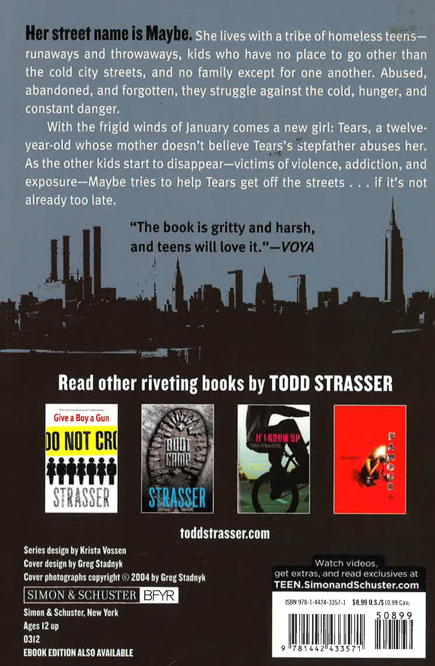 "A powerful and disturbing look at the downward spiral of despair that remains too common for too many teens (School Library Journal)." Her street name is Maybe. She lives with a tribe of homeless teens - runaways and throwaways, kids who have no place to go other than the cold city streets, and no family except for one another. Abused, abandoned, and forgotten, they struggle against weather, hunger, and constant danger. With the frigid winds of January comes a new girl: Tears, a twelve-year-old whose mother doesn't believe her husband is abusive. As the other kids start to disappear - victims of violence, addiction, and exposure - Maybe tries to help Tears get off the streets . . . if it's not already too late.