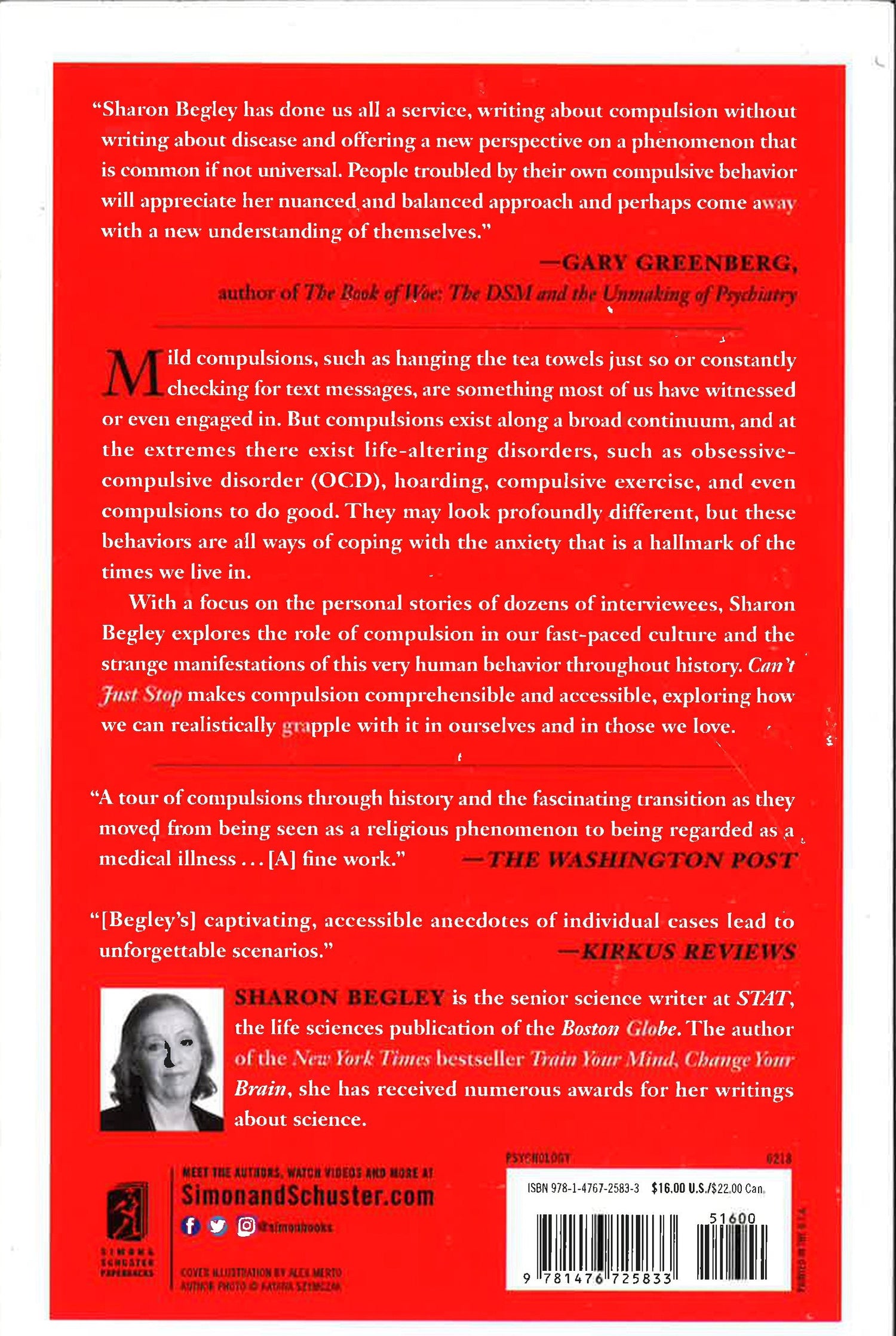 Using in-depth case studies to explore how we grapple with compulsion in ourselves and those we love, Can't Just Stop examines the science behind both mild and extreme compulsive behavior--"a fascinating read about human behavior and how it can go haywire" (The Charlotte Observer). Whether shopping with military precision or hanging the tea towels just so, compulsion is something most of us have witnessed in daily life. But compulsions exist along a broad continuum and, at the opposite end of these mild forms, exist life-altering disorders. Sharon Begley's meticulously researched book is the first to examine all of these behaviors together--from obsessive-compulsive disorder (OCD) to hoarding, to compulsive exercise, even compulsions to do good. They may look profoundly different, but these behaviors are all ways of coping with varying degrees of anxiety. Sharing personal stories from dozens of interviewees, "Begley combines a personal topic with thoughtfulness and sensitivity" (Library Journal) and gives meaningful context to their plight. Along the way she explores the role of compulsion in our fast-paced culture, the brain science behind it, and strange manifestations of the behavior throughout history. Can't Just Stop makes compulsion comprehensible and accessible, with "fresh insight that could fundamentally alter how we think of, and treat, mental illness going forward" (Publishers Weekly).