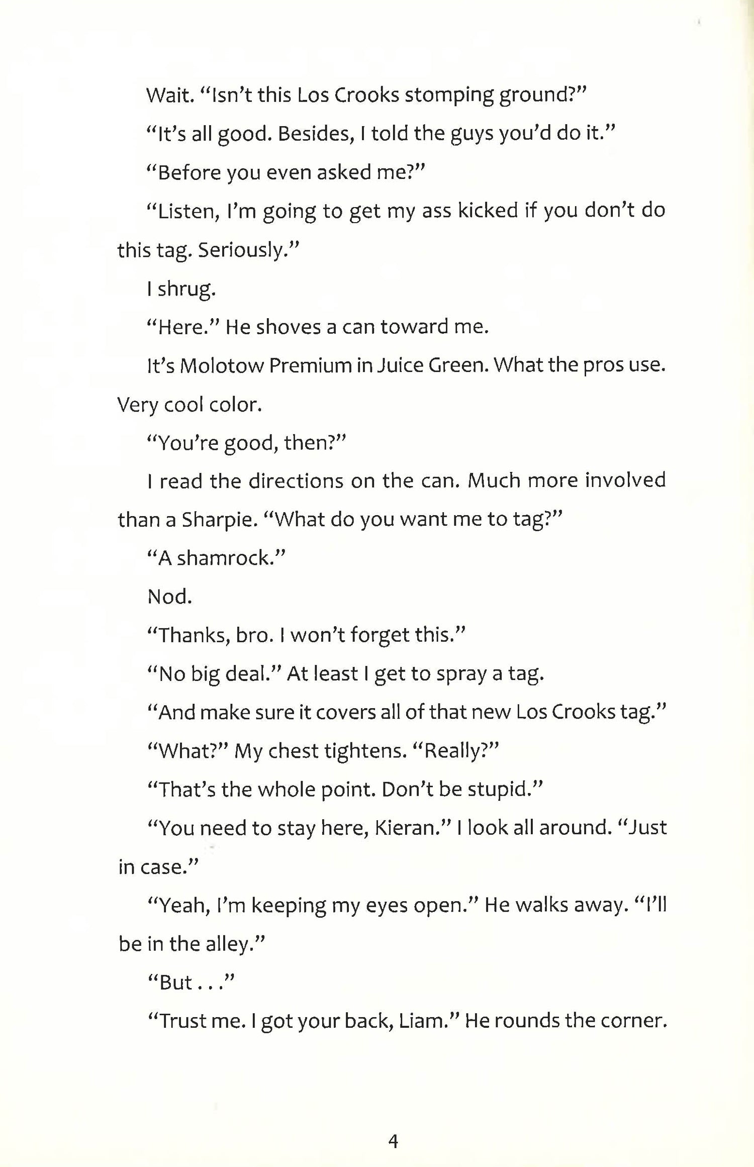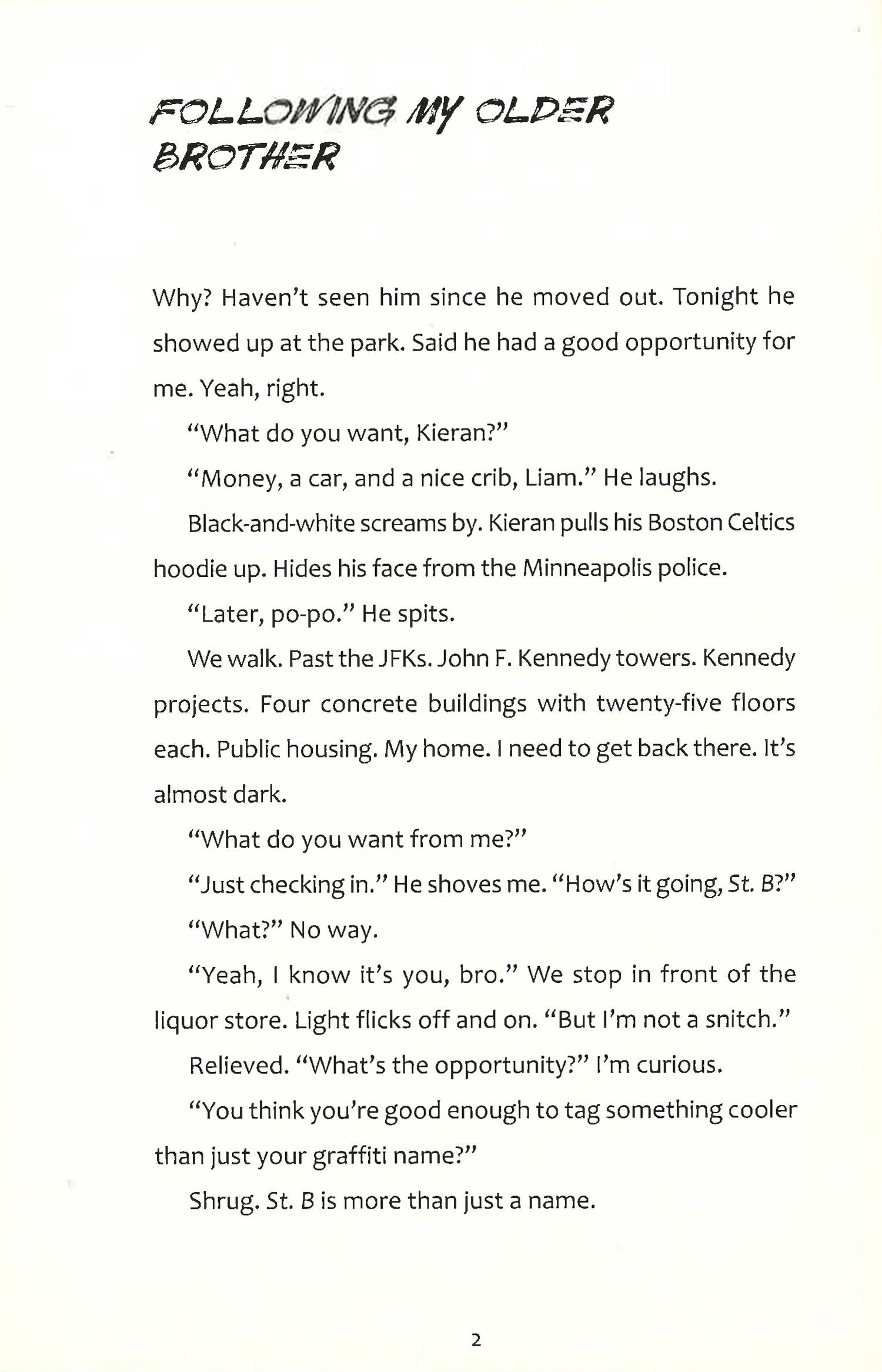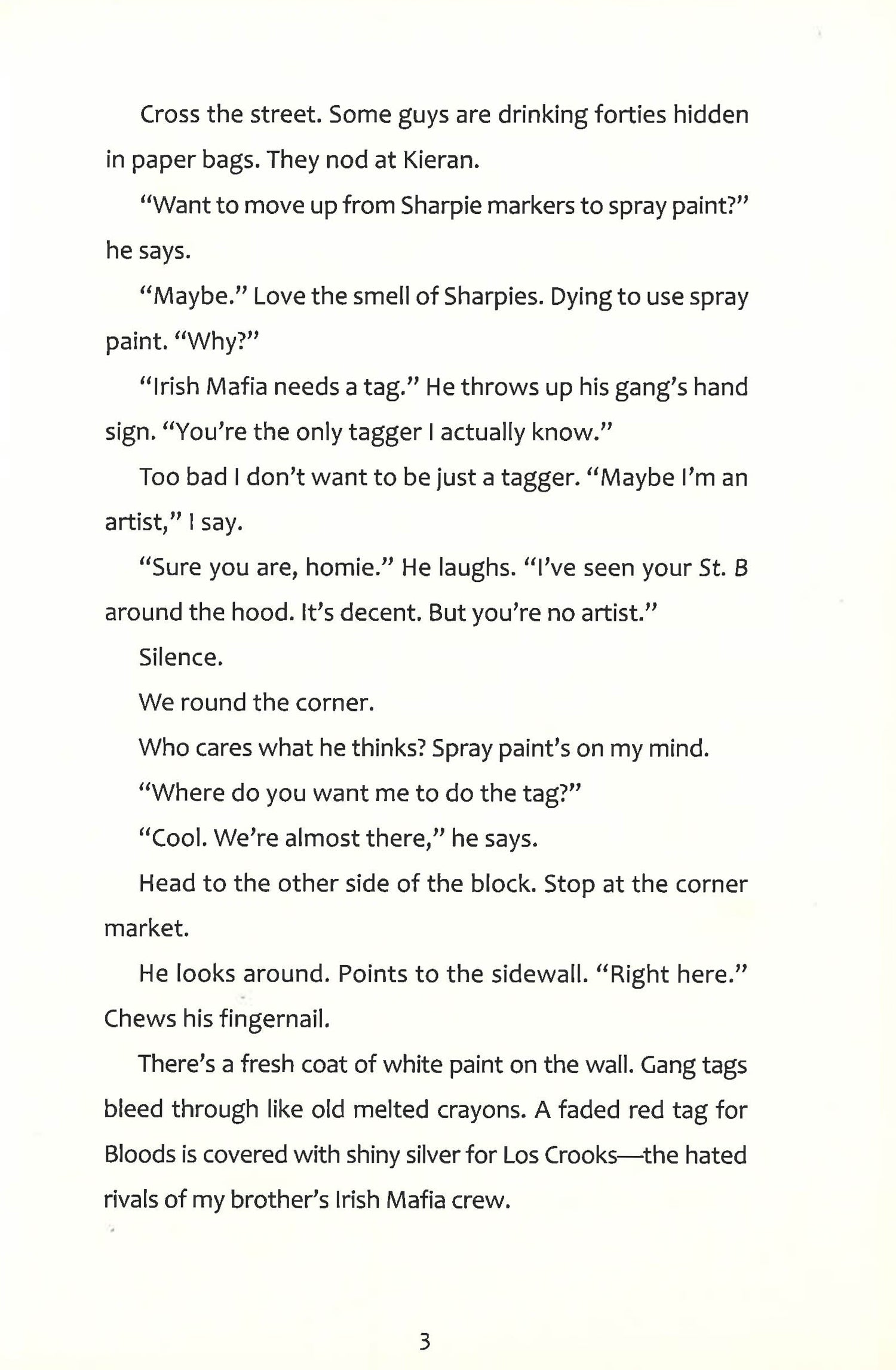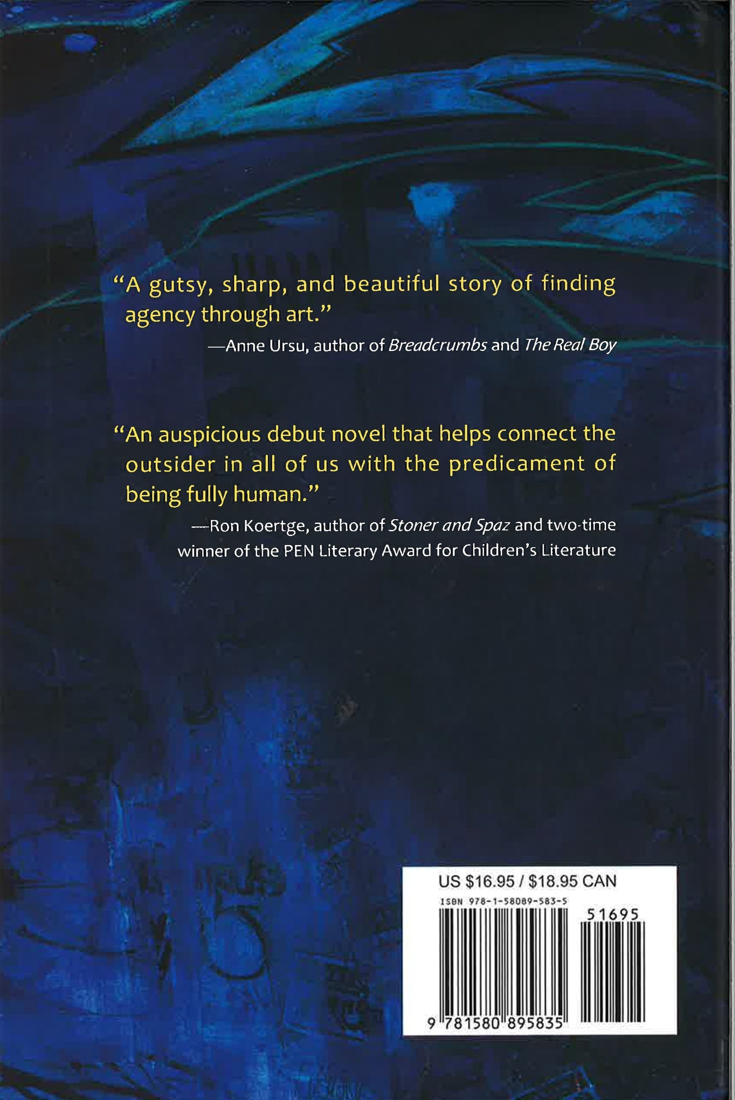 Liam is a fourteen-year-old graffiti artist living in project housing in Minneapolis with his single mother and three younger siblings. When Liam's estranged older brother coerces him to tag a graffiti symbol for a rival gang, Liam's life is threatened. Due to his apathetic attitude in the classroom and on the baseball field, Liam's private-school scholarship is also threatened. His mother decides to send him to Lake Michigan for the summer to live with her best friend, Kat, a sculptor and art teacher, Liam soon delves into the work of Jean-Michel Basquiat, Pablo Picasso, and his own personal aesthetics. He's encouraged to consider his art seriously and how it might contribute to a greater community. Having to decide between staying with Kat and returning home to his siblings who need him, Liam's story inspires him to reinvent himself for the better. *This book may have remainder mark*