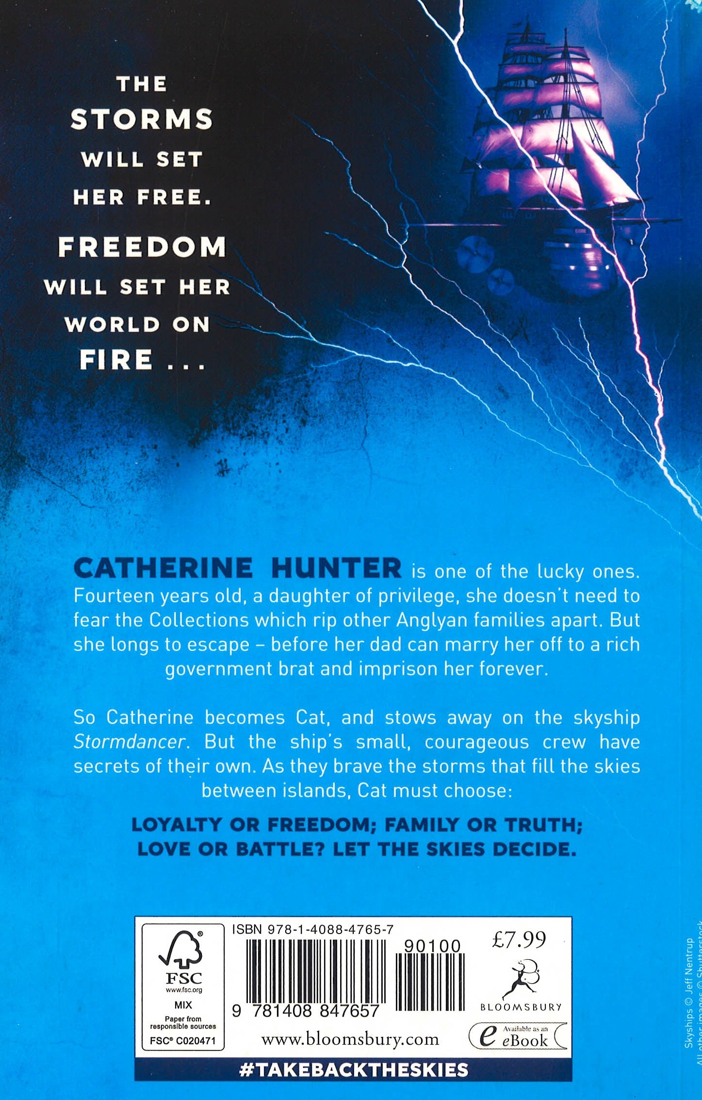 Catherine Hunter is one of the lucky ones. Fourteen years old, a daughter of privilege, she doesn't need to fear the Collections which rip other Anglyan families apart. But she longs to escape - before her dad can marry her off to a rich government brat and imprison her forever. So Catherine becomes Cat, and stows away on the skyship Stormdancer . But the ship's small, courageous crew have secrets of their own. As they brave the storms that fill the skies between islands, Cat must choose: loyalty or freedom; family or truth; love or battle? Let the skies decide.