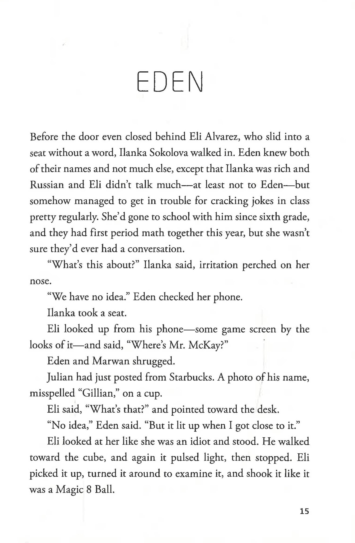 "Repeatedly surprising and genuinely chilling." - E. Lockhart, bestselling author of We Were Liars and Genuine Fraud From the acclaimed author of The Leaving comes a new psychological thriller that challenges our trust in the electronic devices we keep close. Eden, Eli, Marwan, and Ilanka barely know each other beyond having a class or two together. But when they are all summoned via messaging app to an empty classroom after school, they find a small cube sitting on a desk. Its sides light up with rules for them: Do not tell anyone about the device. Never leave the device unattended. And then, Take me with you . . . or else. At first they think it's some kind of prank or a social experiment orchestrated by the school administration. Still, they follow its instructions until the newly-formed group starts to splinter. Nobody has time for these games--their lives are complicated enough. But the device seems increasingly invested in the private details of their lives. And disobeying its rules has scary--even life-threatening--consequences . . . This timely thriller probes our dependence on personal technology and challenges the notion that our devices are keeping us connected. The truth may very well be the opposite.