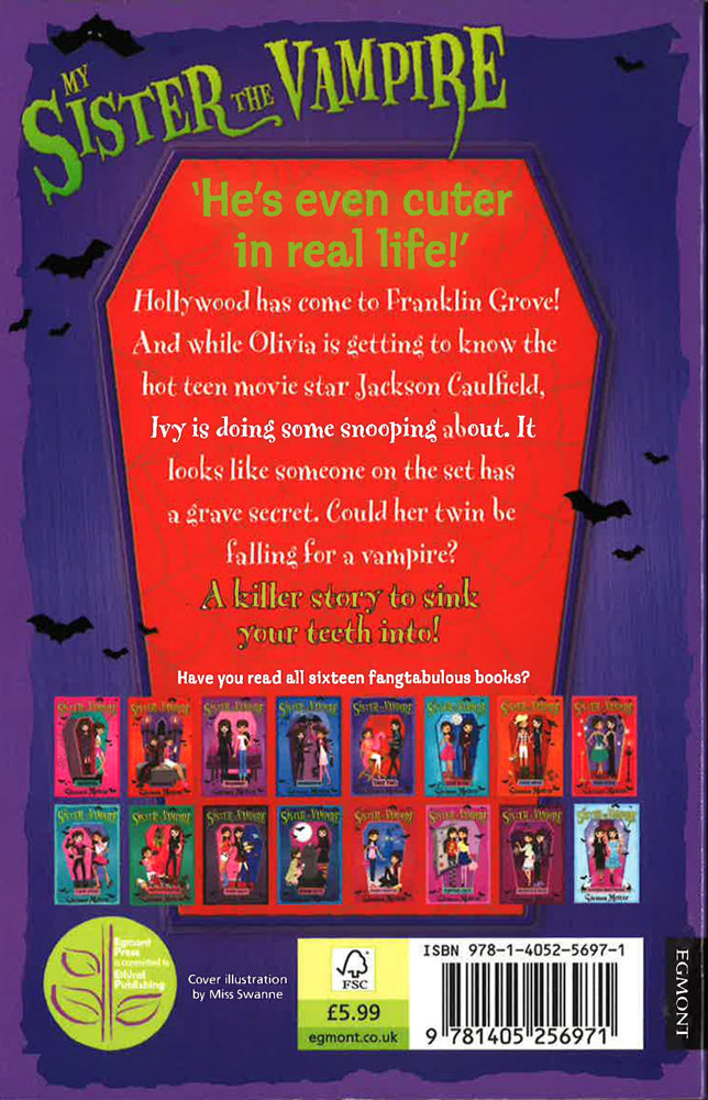 Sink your teeth into Sienna Mercer's fifth super-girly vampire story for girls. Hollywood has come to Franklin Grove! Olivia is very excited. Jackson Caulfield - the hot teen movie star - is shooting a movie in her home town! And there's a chance to win a part in the film. So when she bumps into Jackson and he shows her around the set, she thinks her dreams have come true. But there's a few things that get her vampire twin Ivy suspicious. Could Jackson possibly be a vampire? It would be Hollywood's biggest secret! But, more importantly, Olivia doesn't want a vampire boyfriend and she's quickly falling for him! It's up to Ivy to do some undercover sleuthing ...These kinds of situations only happen in My Sister the Vampire. A vampire book for girls who want to read about young love and innocent paranormal romance.