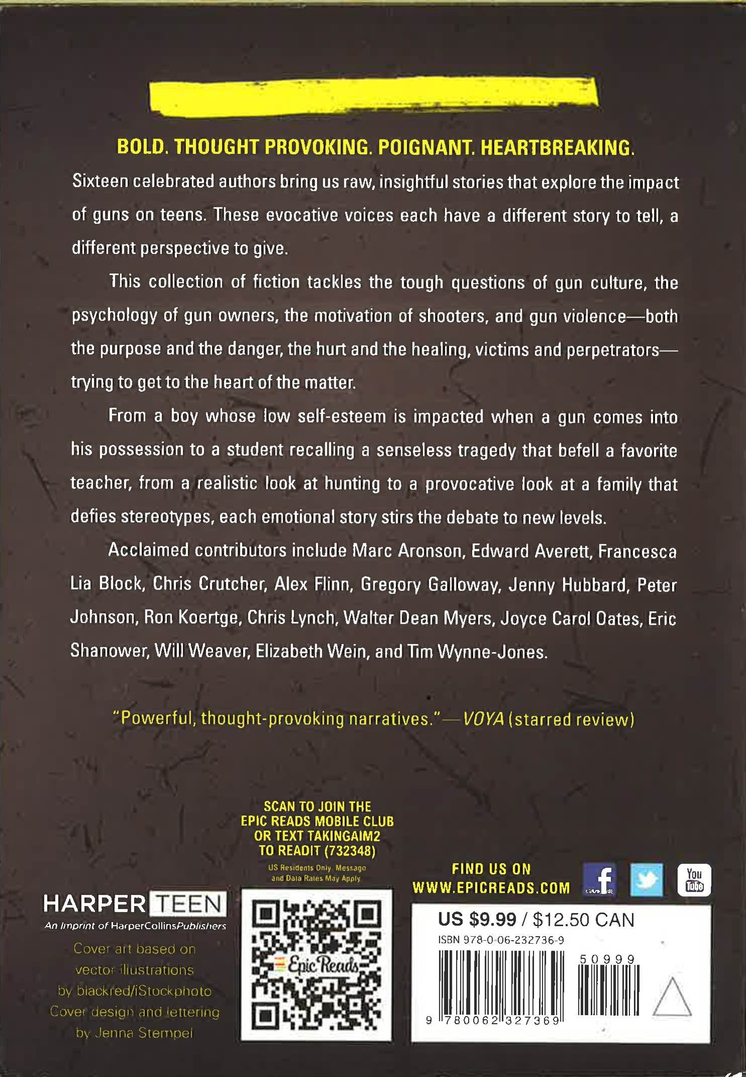 Powerful, riveting, real. Sixteen celebrated authors bring us raw, insightful stories that explore guns and teens in a fiction collection that is thought provoking and emotionally gripping. For fans of Forgive Me, Leonard Peacock and Give a Boy a Gun, and with an array of YA talent like the late great Walter Dean Myers, the poetic Joyce Carol Oates, the prophetic Elizabeth Wein, and the gritty Chris Crutcher, these are evocative voices that each has a different perspective to give. Capturing the hurt and the healing, victims and perpetrators, these stories get to the heart of the matter.From a boy whose low self-esteem is impacted when a gun comes into his possession to a student recalling a senseless tragedy that befell a favorite teacher, from a realistic look at hunting to a provocative look at a family that defies stereotypes, each emotional story stirs the debate to new levels. The juxtaposition of guns and their consequences offers moving tales, each a reminder of how crucial the question of guns in our society is, and the impact they have on all of us.