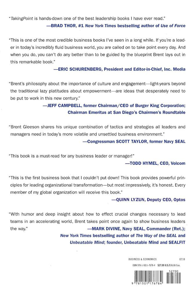 Decorated Navy SEAL, successful businessman and world-renowned speaker Brent Gleeson shares his revolutionary approach to navigating and leading change in the workplace--with a foreword by #1 New York Times bestselling author Mark Owen. Inspired by his time as a Navy SEAL and building award-winning organizations in the business world, Brent Gleeson has created a powerful roadmap for today's existing and emerging business leaders and managers to improve their ability to successfully navigate organizational change. Over the past ten years since leaving the SEAL Teams, Gleeson has become a well-respected thought leader and expert in business transformation. He has spoken to and consulted with hundreds of organizations across the globe and inspired thousands of business leaders through his highly insightful philosophies on leadership, culture and building high-performance teams that achieve winning results. In TakingPoint, Gleeson shares his ten-step program that he has implemented in his own companies and for his high-profile clients--giving leaders and managers actionable insights and a framework for successful execution. TakingPoint brilliantly captures the structures, behaviors and mindsets required to build successful twenty-first century organizations. With a strong emphasis on communication, culture, engagement, accountability, trust, and resiliency, Gleeson's methods have helped hundreds of companies around the world transform the way they think about change, and can help yours do the same. For the last five years, Gleeson has shared his philosophies through his weekly columns on Forbes and Inc. And now, for the first time ever, they are captured in this entertaining and highly prescriptive book. Steps include: -Culture: The Single Most Important Enabler