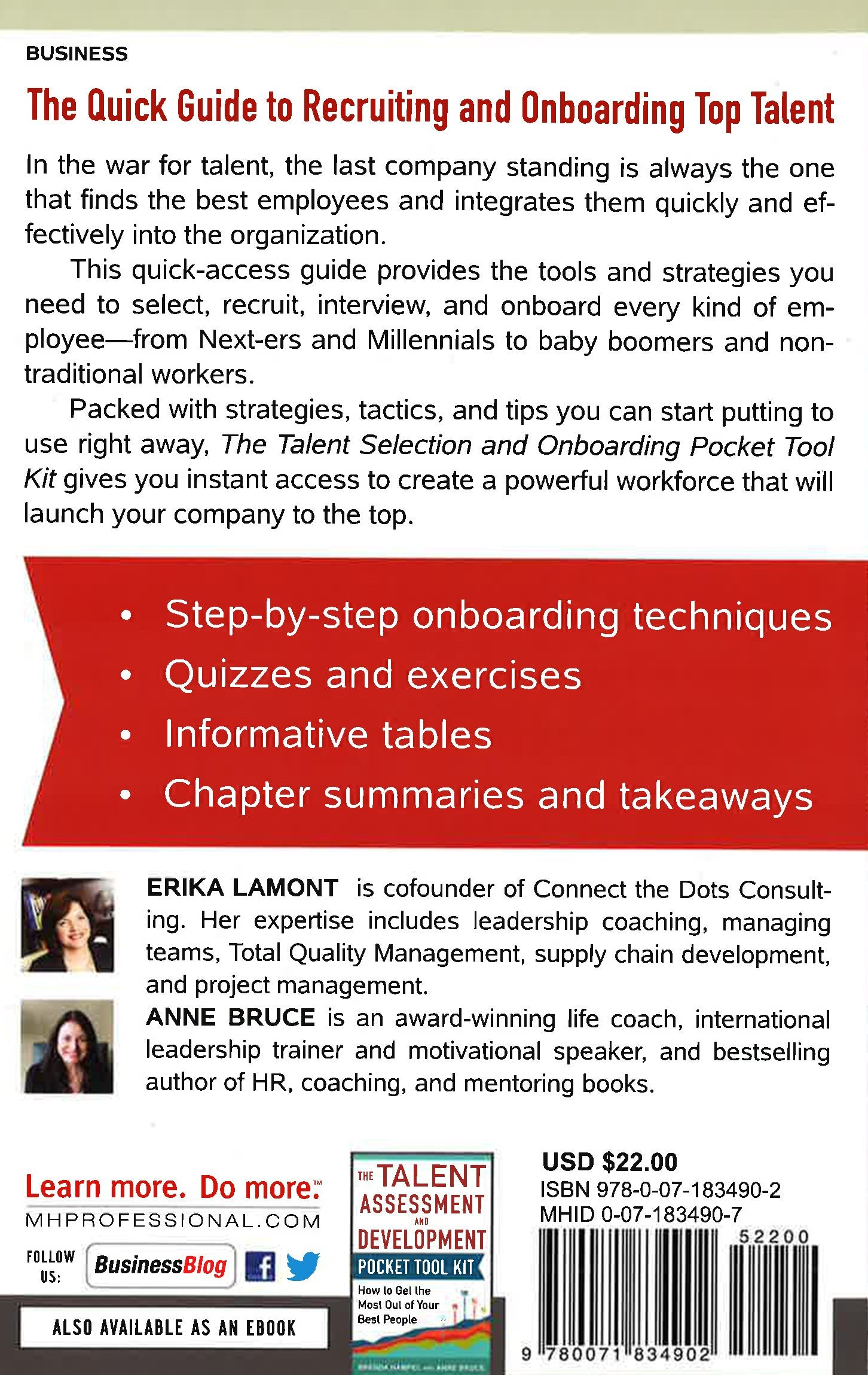 The Quick Guide to Recruiting and Onboarding Top TalentIn the war for talent, the last company standing is always the one that finds the best employees and integrates them quickly and effectively into the organization.This quick-access guide provides the tools and strategies you need to select, recruit, interview, and onboard every kind of employee--from Next-ers and Millennials to baby boomers and nontraditional workers. Packed with strategies, tactics, and tips you can start putting to use right away, The Talent Selection and Onboarding Pocket Tool Kit gives you instant access to create a powerful workforce that will launch your company to the top.