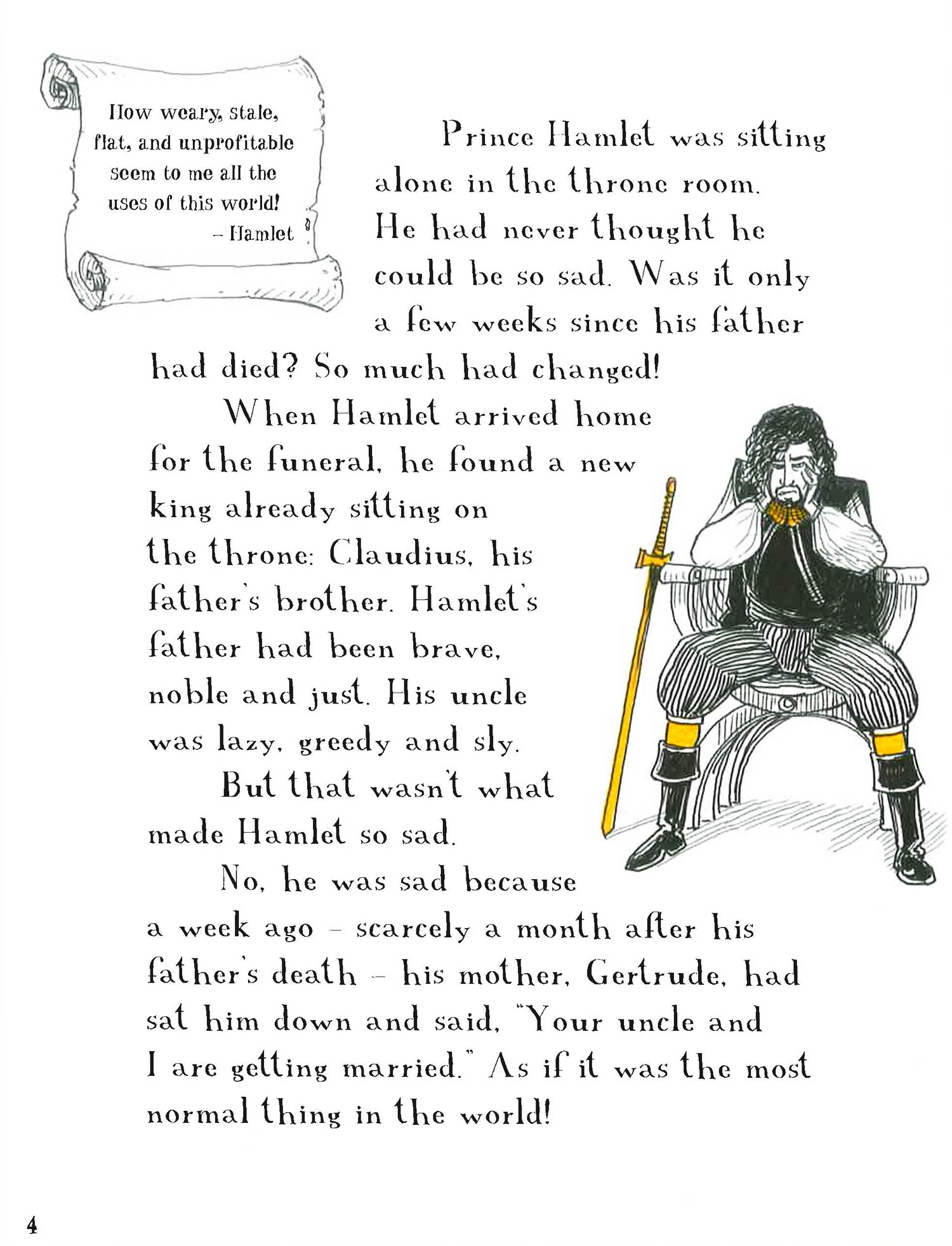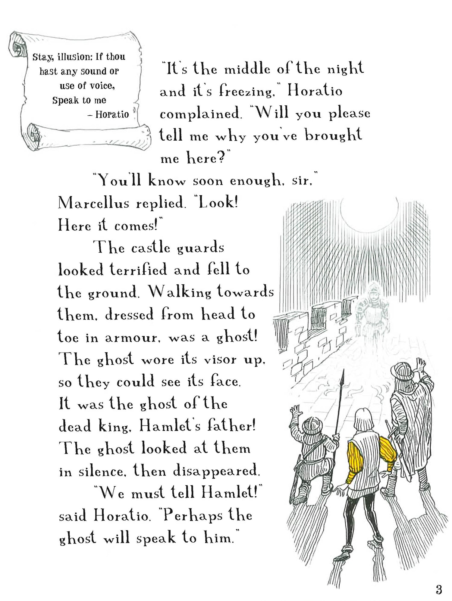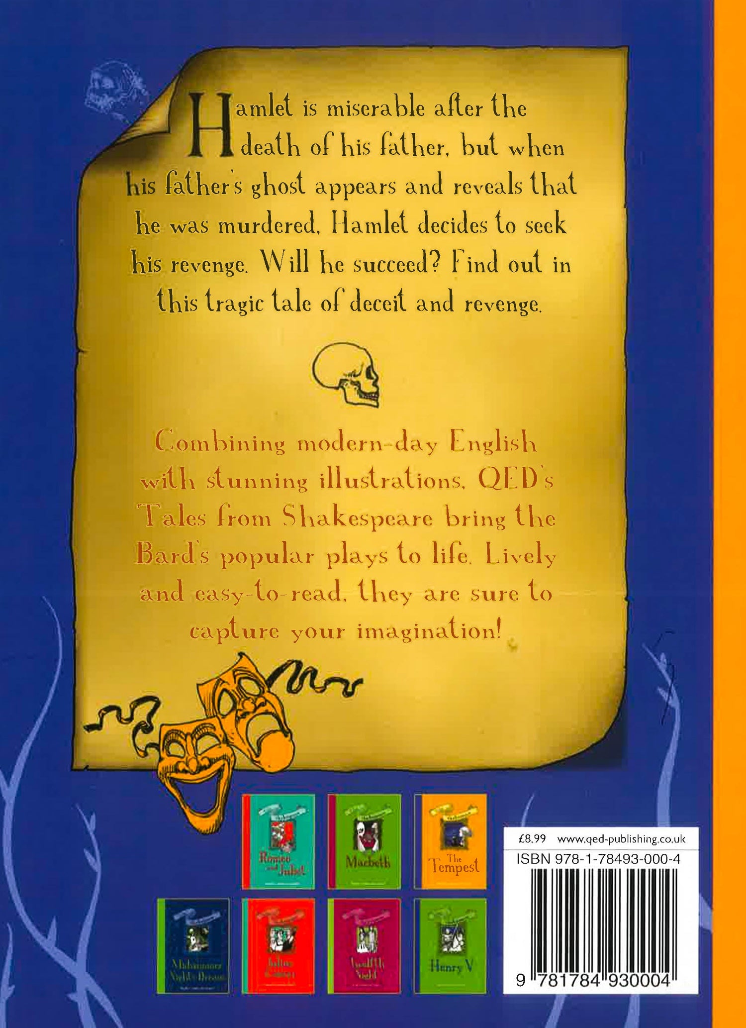 Hamlet is miserable after the death of his father, but when the ghost of his father appears and reveals that he was murdered, Hamlet decides to seek his revenge...Will he succeed? Step inside for a tragic tale of deceit and revenge. QED has chosen four plays to continue the successful Tales from Shakespeare series. These titles serve as the perfect introduction into the works of Shakespeare. The plays are retold as stories using clear and contemporary language, whilst each title keeps its originality by including key quotations from the original text. Lively illustrations bring these popular plays to life and will be sure to captivate the imagination and interest of young readers.