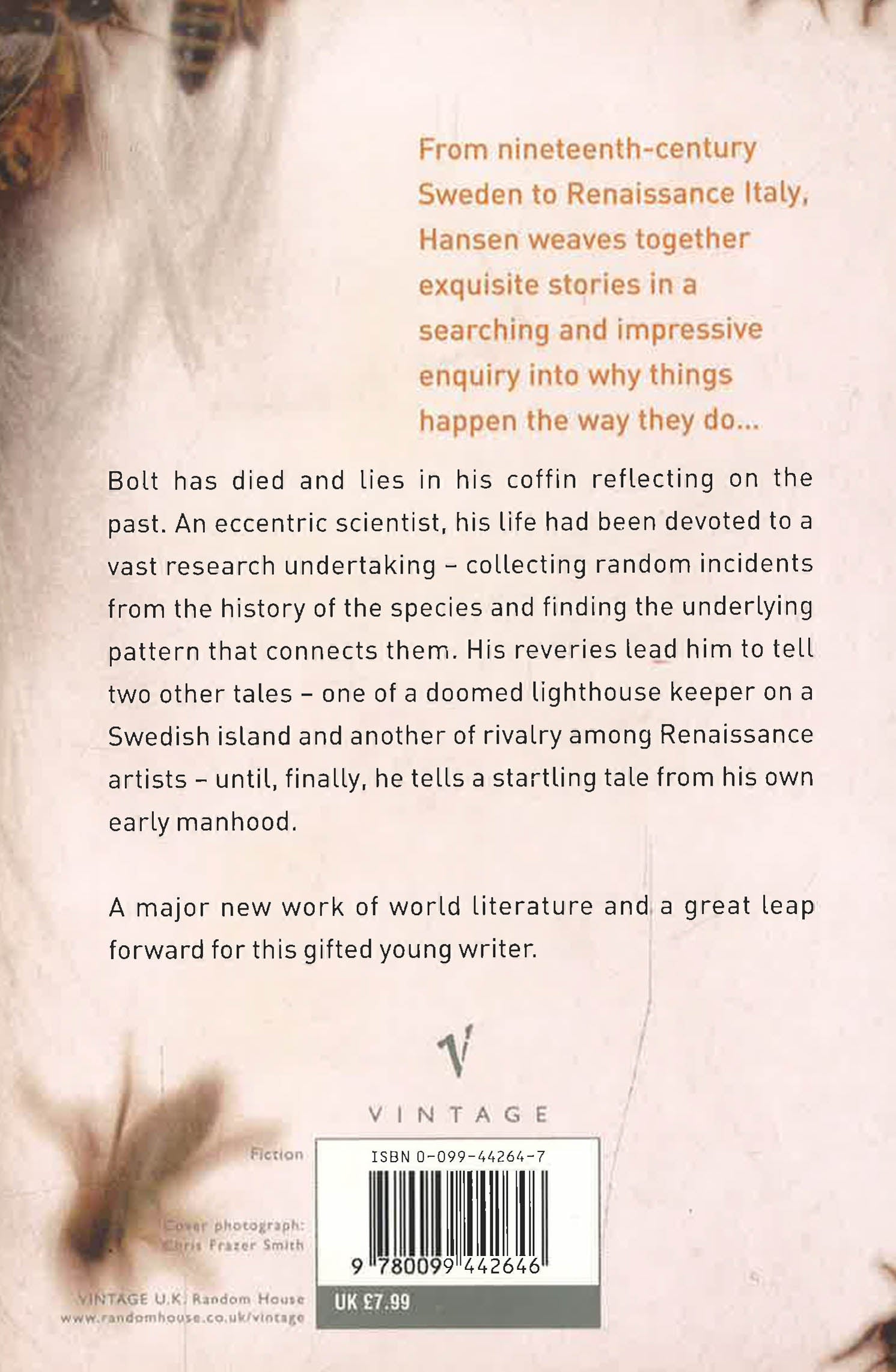 From nineteenth-century Sweden to Renaissance Italy, Hansen weaves together exquisite stories in a searching and impressive enquiry into why things happen the way they do... Bolt has died and lies in his coffin reflecting on the past. An eccentric scientist, he devoted his life to a vast research undertaking - collecting random incidents from the history of the species and finding the underlying pattern that connects them. His reveries lead him to tell two other tales - one of a doomed lighthouse keeper on a Swedish island and another of rivalry among Renaissance artists - until, finally, he tells a startling tale from his own early manhood.