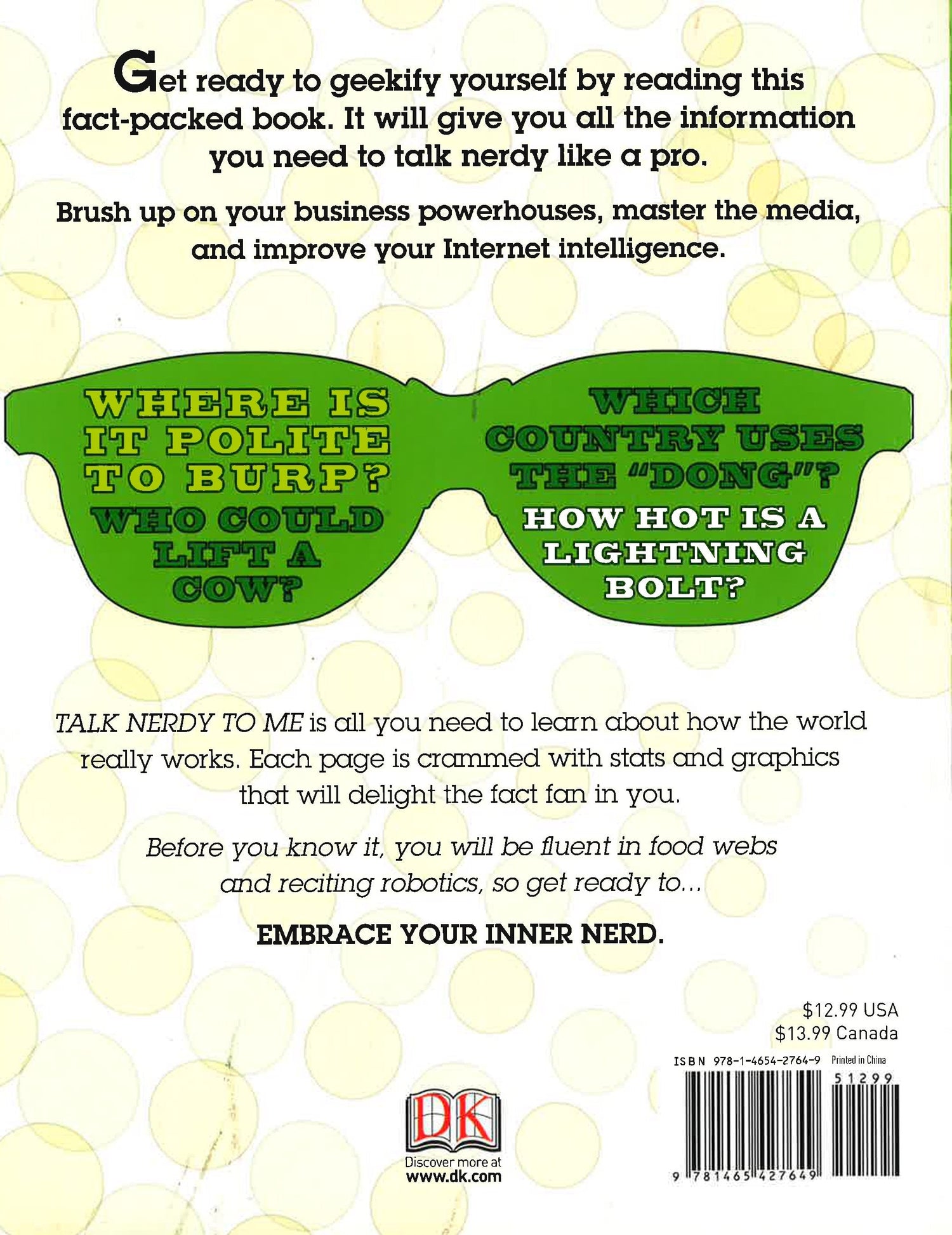 Perfect for the Internet generation, "Talk Nerdy to Me" provides readers with a new way of exploring, reading, seeing, and understanding the world around them. Previously published as "Look Now," "Talk Nerdy to Me" presents complex information in a simple format by combining facts, figures, and statistics with infographics. From skyscrapers scaled to show the population density of cities to a pyramid chart showing the youngest and oldest populations by country, the visual representations will entrance readers giving them all the information they need to learn about how the world really works. Whether it's sweeping general data (How much cash is there in the world? How many people are there on the planet? How do teenagers spend their time?) or fun facts (What are your chances of being killed by a coconut? How does a cocoa bean become a chocolate bar? What countries celebrate what holidays?), "Talk Nerdy to Me" will help kids embrace their inner nerd.