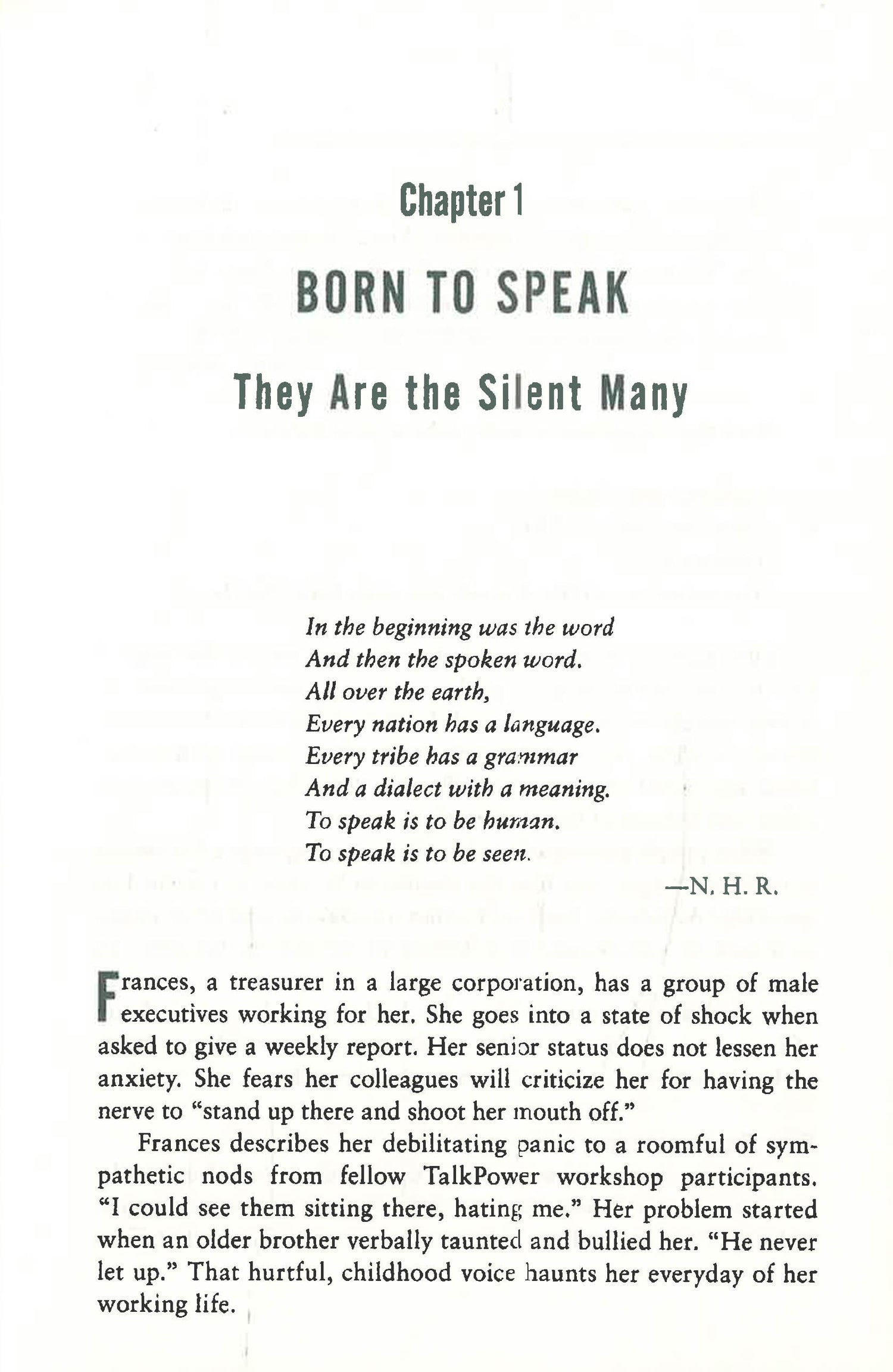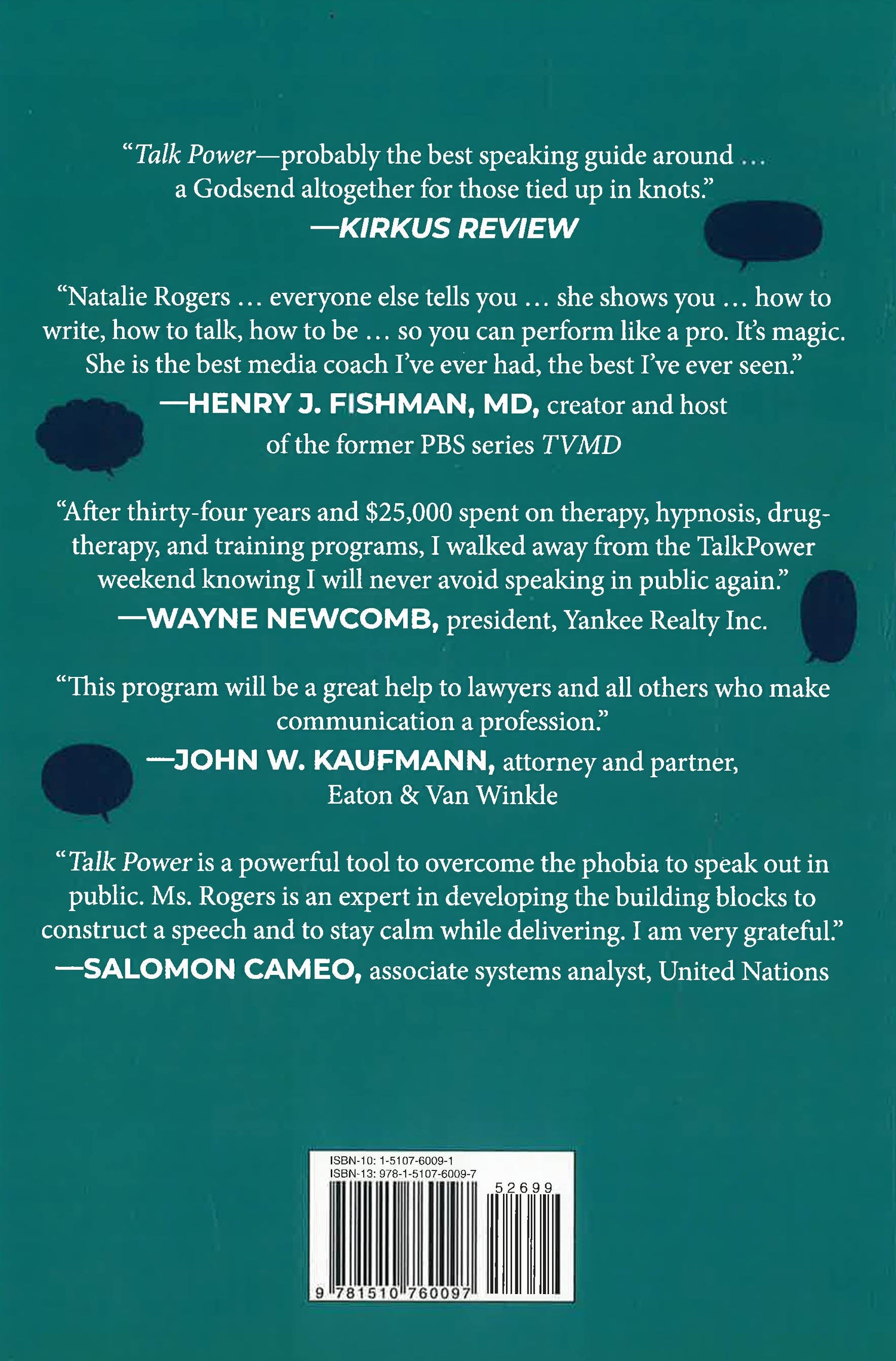 Natalie H. Rogers’ latest book Talk Power: The Mind-Body Way To Speak Without Fear offers a different approach. Instead of the traditional public speaking classes based upon lectures, theory, tips, hints, video therapy, and suggestions about body language, etc., Ms. Rogers’ original breakthrough training program focuses upon you, your mind and body and the chaos that is actually happening inside of you when you face an audience.