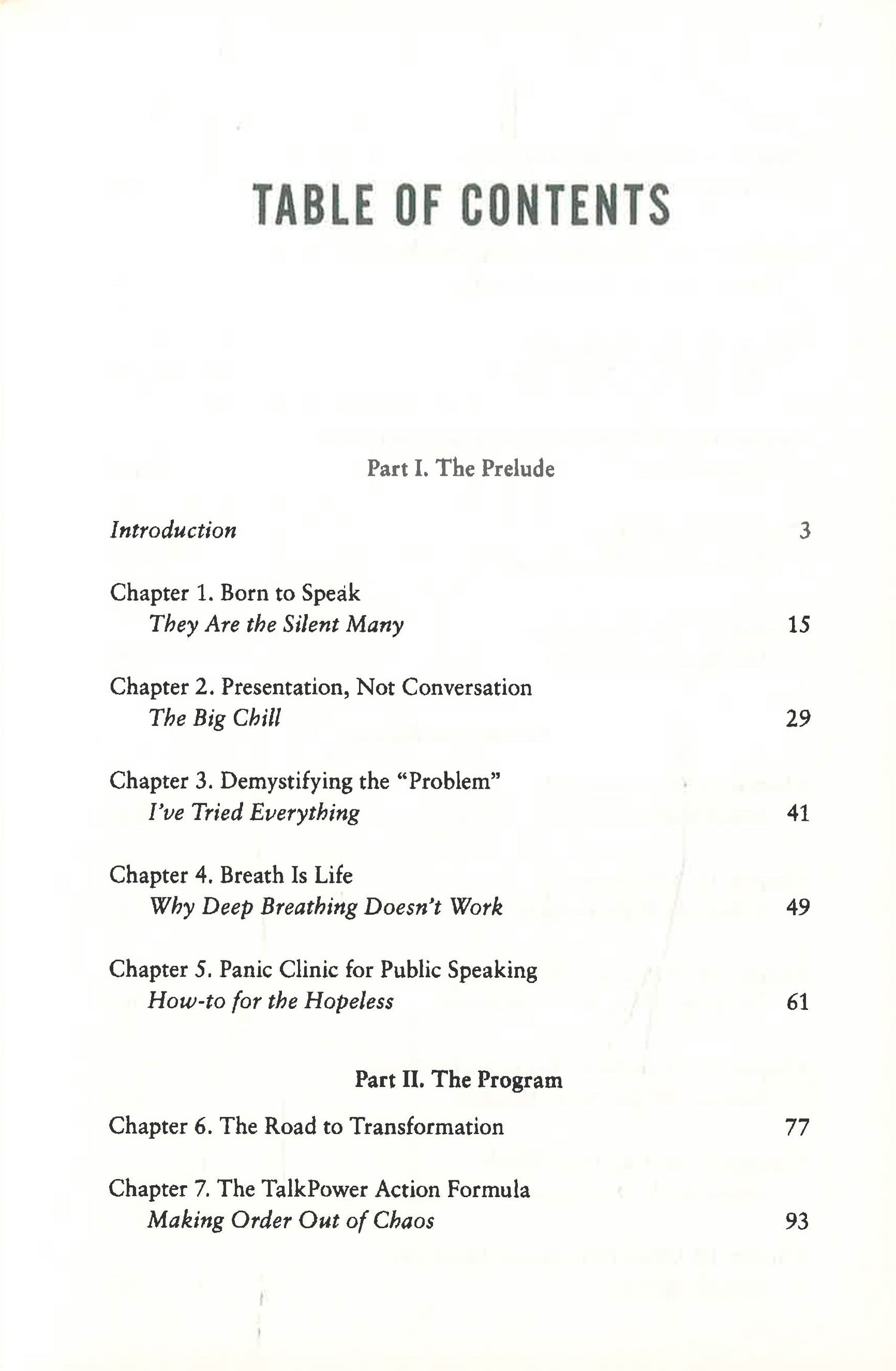 By practicing her simple and practical Talk Power step-by-step mind-body exercises, drills, and routines you will develop the performance skills necessary to speak comfortably and confidently in front of an audience of any size. Just as with regular practice one is able to grow a muscle on an arm, with the Talk Power training program you will develop the skills you need for the mastery of every aspect of public speaking. This system of exercises, integrating neuroscience, behavior modification, performance techniques, speech crafting, and leadership skills, actually affects and remodels your brain by developing new neural pathways for performance skills that eliminates anxiety and other negative reactions to Public Speaking.
