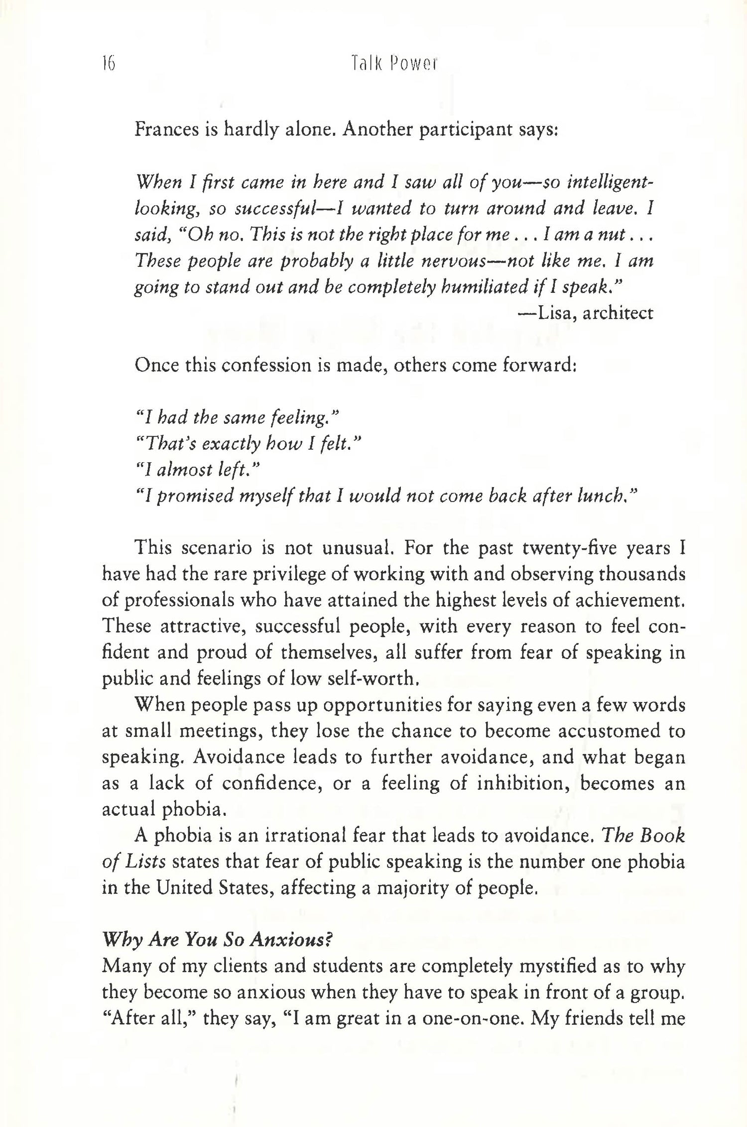 Over the past thirty-five years, Ms. Rogers’ Panic Clinic For Public Speaking Workshops, with 13,000 successful and satisfied participants, have proven that this unique program works. No matter how severe your condition may be, practicing at home with the easy step-by-step exercises, routines, and drills will help people who previously could never speak in public develop the performance skills necessary for ending fear of public speaking. Talk Power will: