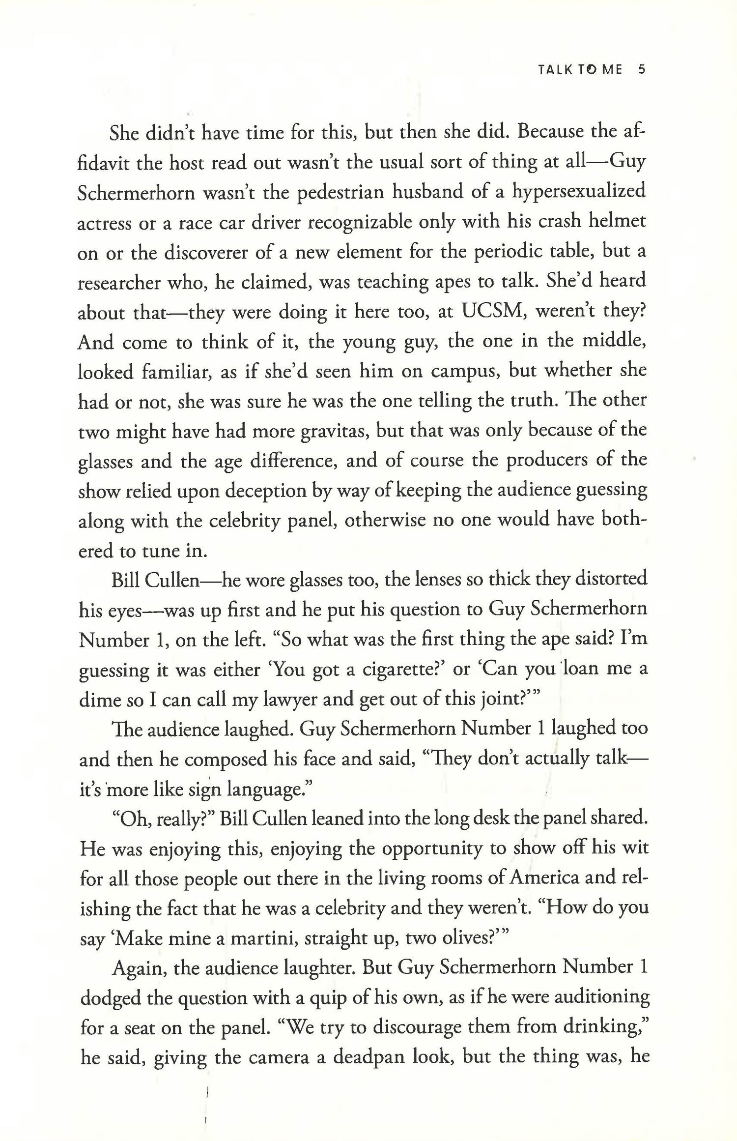 These are some the questions T.C. Boyle asks in his wide-ranging and hilarious new novel Talk to Me , exploring what it means to be human, to communicate with another, and to truly know another person—or animal…