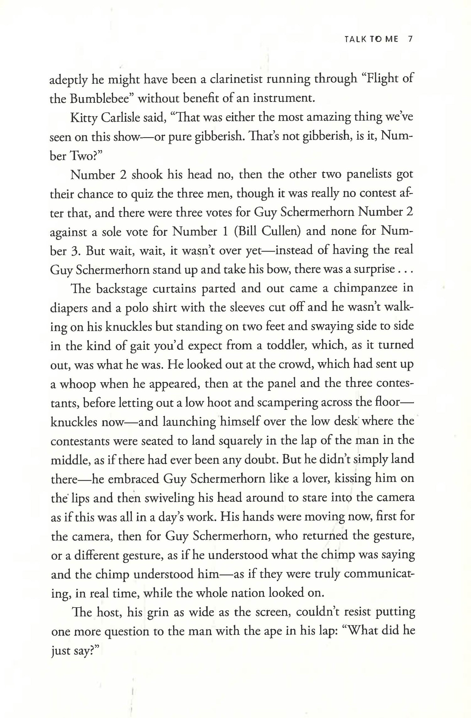 What if it were possible to speak to the members of another species—to converse with them, not just give commands or coach them but to really have an exchange of ideas and a meeting of minds? Did apes have God? Did they have souls? Did they know about death and redemption? About prayer? The economy, rockets, space? Did they miss the jungle? Did they even know what the jungle was? Did they dream? Make wishes? Hope for the future?