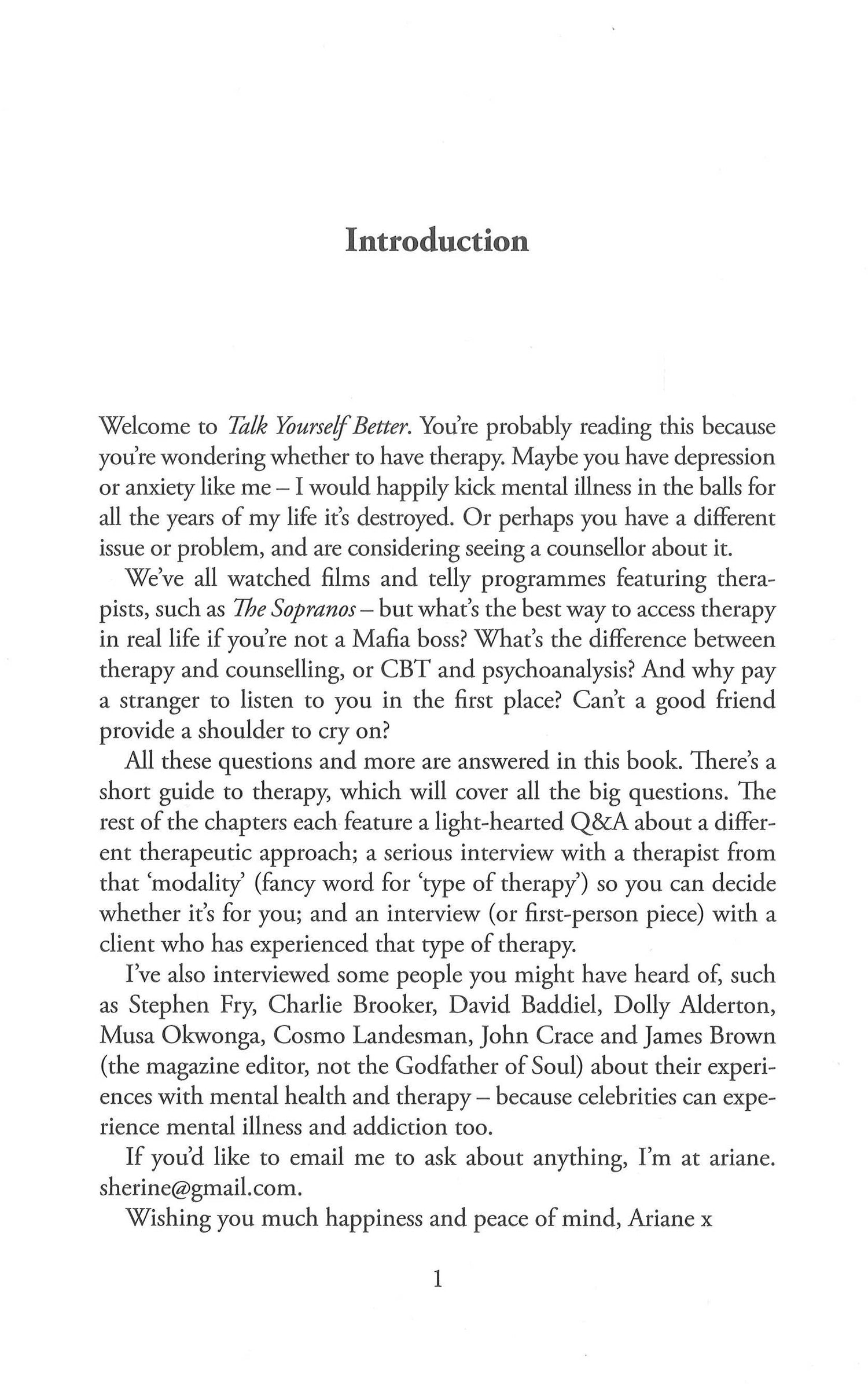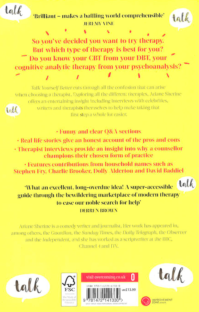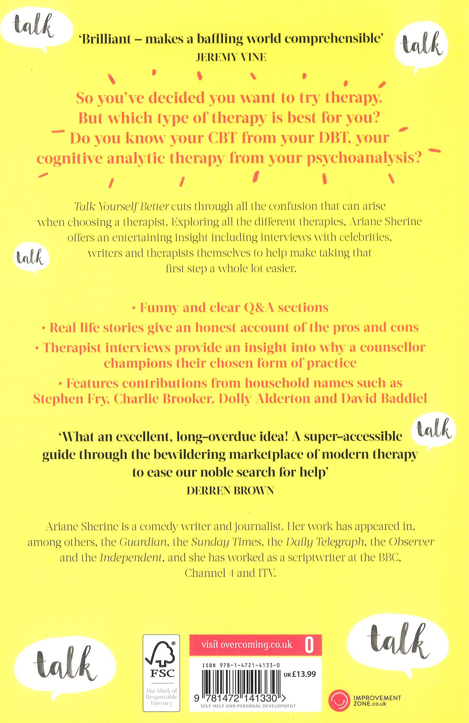 Brilliant - makes a baffling world comprehensible' - Jeremy Vine'It's everything you didn't know about therapy or were afraid to ask, but by no means the daunting read you might imagine. Sherine, an award-winning comedian and writer for TV and radio, has persuaded such people as Stephen Fry, David Baddiel and Dolly Alderton to write warts-and-all pieces for the book about their struggles with mental health' - The TimesSo you've decided you want to try therapy. But which type of therapy is best for you? Do you know your CBT from your DBT, your cognitive analytic therapy from your psychoanalysis?Talk Yourself Better cuts through the confusion when it comes to choosing a therapist. Exploring all the different kinds of therapy available, Ariane Sherine offers an entertaining insight into each type, including interviews with celebrities, writers and therapists themselves to help make taking that first step a whole lot easier.* Funny and clear Q&A sections guide you through the differences between therapies* Real life stories give an honest account of the pros and cons of each form of therapy* Therapist interviews give an insight into why a counsellor would champion their chosen form of practice* Features contributions from household names such as Stephen Fry, Charlie Brooker, Dolly Alderton and David Baddiel.This is an essential overview of the bewildering range of options available to you when you want to solve a psychological or emotional problem. Friendly and accessible, Talk Yourself Better stresses the importance of talk therapy in improving your mental health.