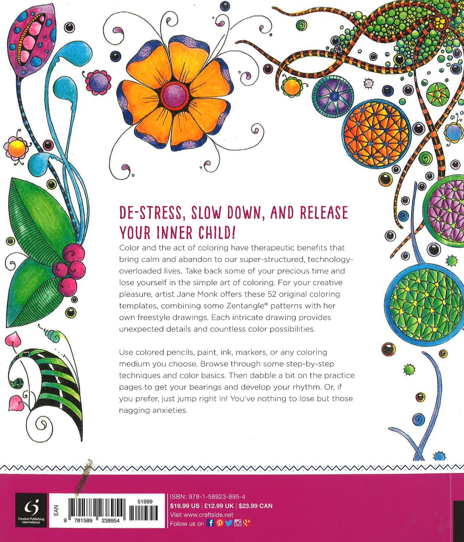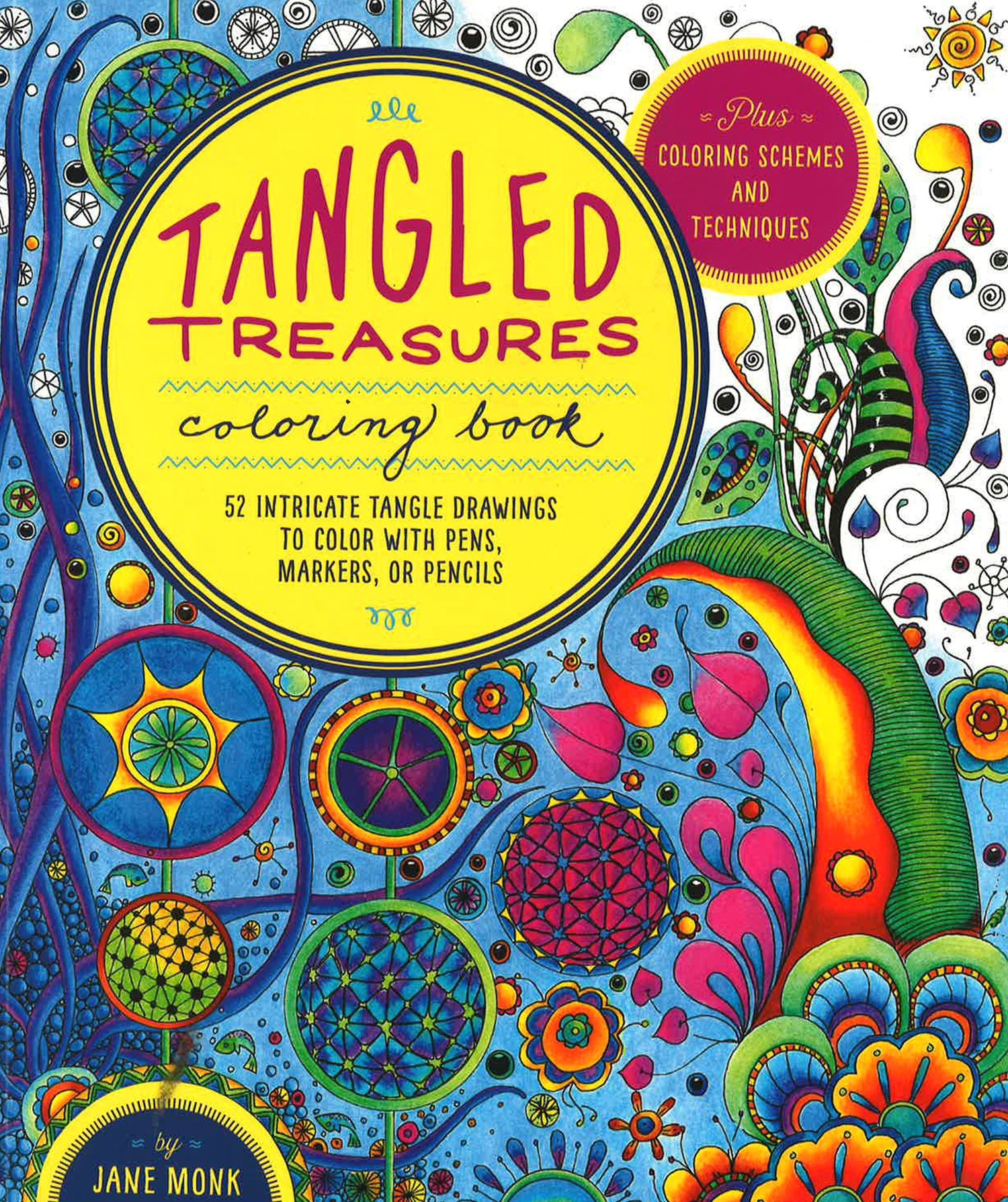 Enjoy the rhythmic relaxation of coloring original tangle artwork by Jane Monk! Coloring is a peaceful and pleasant right-brain activity that can provide a soothing and enjoyable pastime for people of any age. Unlike painting, you don't need to have the skills of an artist to create a masterpiece. All you need is to pick the colors and draw within the lines. The results can be miraculous! Disconnect temporarily from the everyday hustle and bustle and escape to a world filled with creativity, inspiration, and serenity. Coloring helps reduce stress levels, elevates focus, and promotes a soothing, relaxing frame of mind and sense of well being. The 52 designs in the Tangled Treasures Coloring Book are all original tangle artwork by certified Zentangle teacher Jane Monk. Monk begins the book by leading you through some basic techniques for using colored pencils or fine-point markers to color the designs, including skills like shading and blending. Each of the designs is printed on a page with a blank back, so you can remove the art from the book and frame it, if you like. Jump right in to the relaxing spell woven by Zentangles!